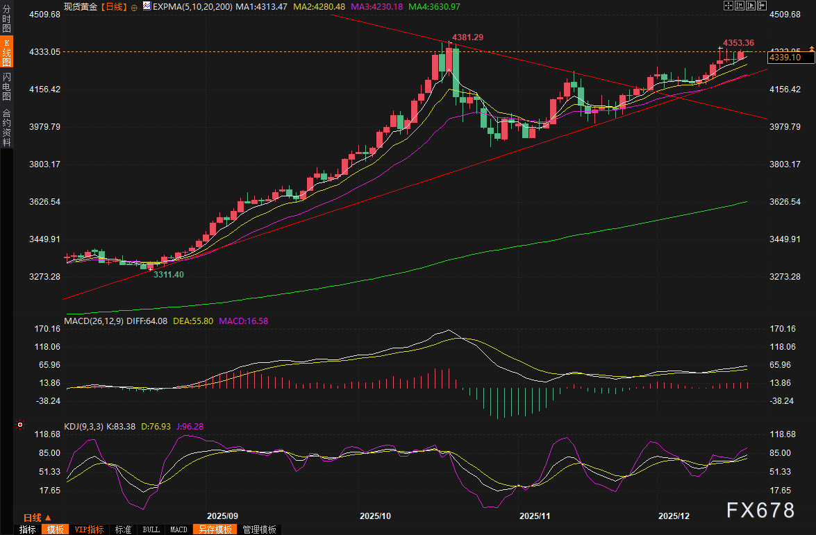 具体来看,周二公布的就业报告虽显示新增岗位强劲,但失业率的上升让市场对经济韧性产生疑虑。美联储理事克里斯托弗·沃勒在近期活动中明确表示,鉴于就业增长转弱和通胀风险下降,美联储仍有进一步降息的空间。这一表态与亚特兰大联储总裁博斯蒂克的保守观点形成对比,后者认为经济增长将反弹至2.5%左右,且物价压力将维持高位,因此2026年可能不会进一步降低借贷成本。这种美联储内部的分歧进一步放大市场对降息的预期,推动黄金价格逼近上周五的触及的近八周高点4353.36美元,盘中最高触及4348.70美元/盎司。