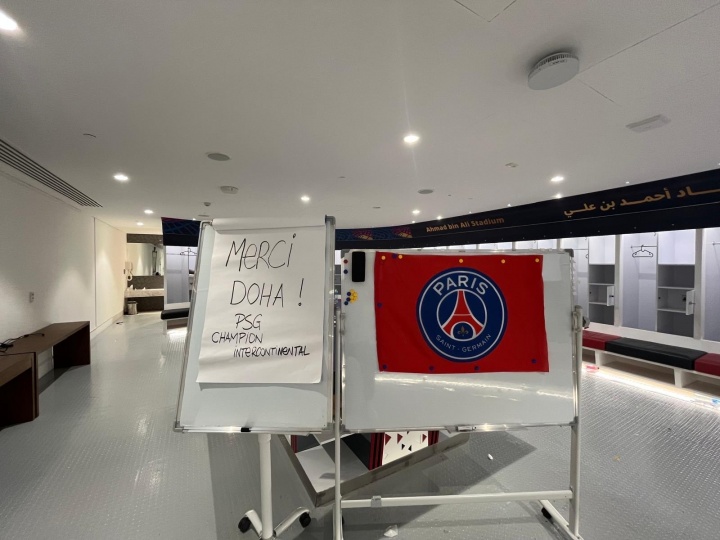 巴黎全队还在白板上写道:“谢谢多哈!来自巴黎圣日耳曼——洲际杯冠军。”