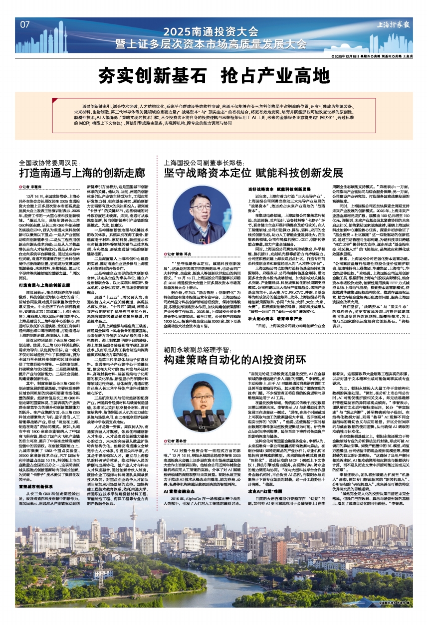 “‘坚守战略资本定位,赋能科技创新发展’,这既是对未来方向的深刻思考,也是面向广大科学家、企业家、投资人等创新伙伴发出的共同倡议。”12月16日,上海国投公司副董事长郑杨在2025南通投资大会暨上证多层次资本市场高质量发展大会上表示。