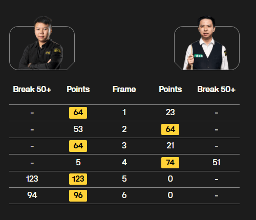 全场比赛,周跃龙一杆破百(123)和一杆50+(94),肖国栋打出单杆51分。