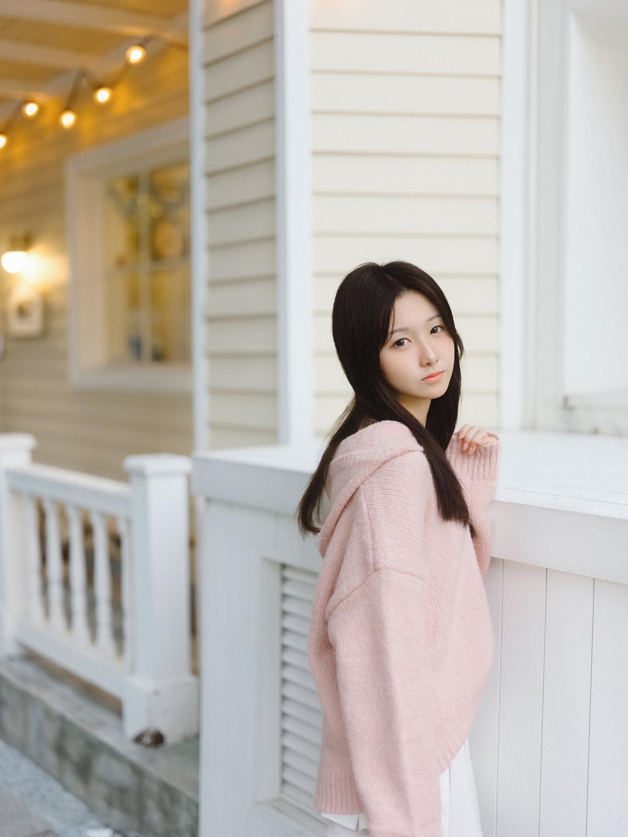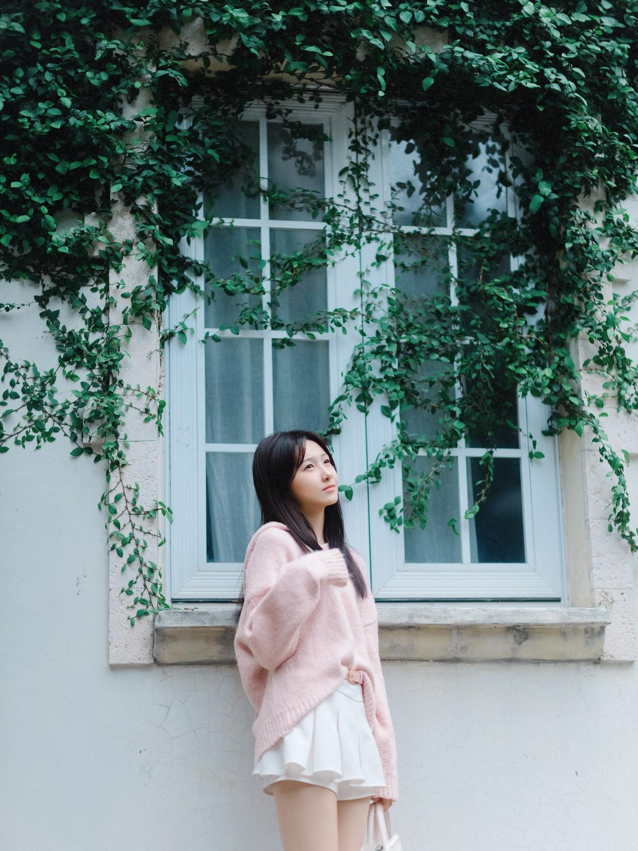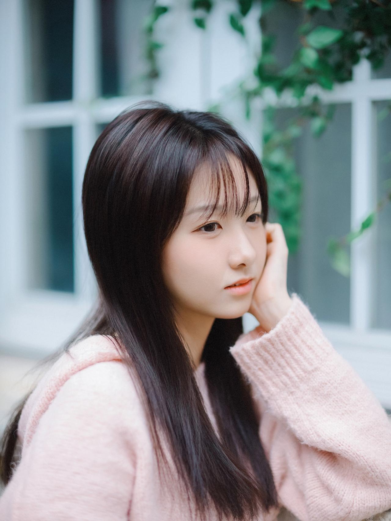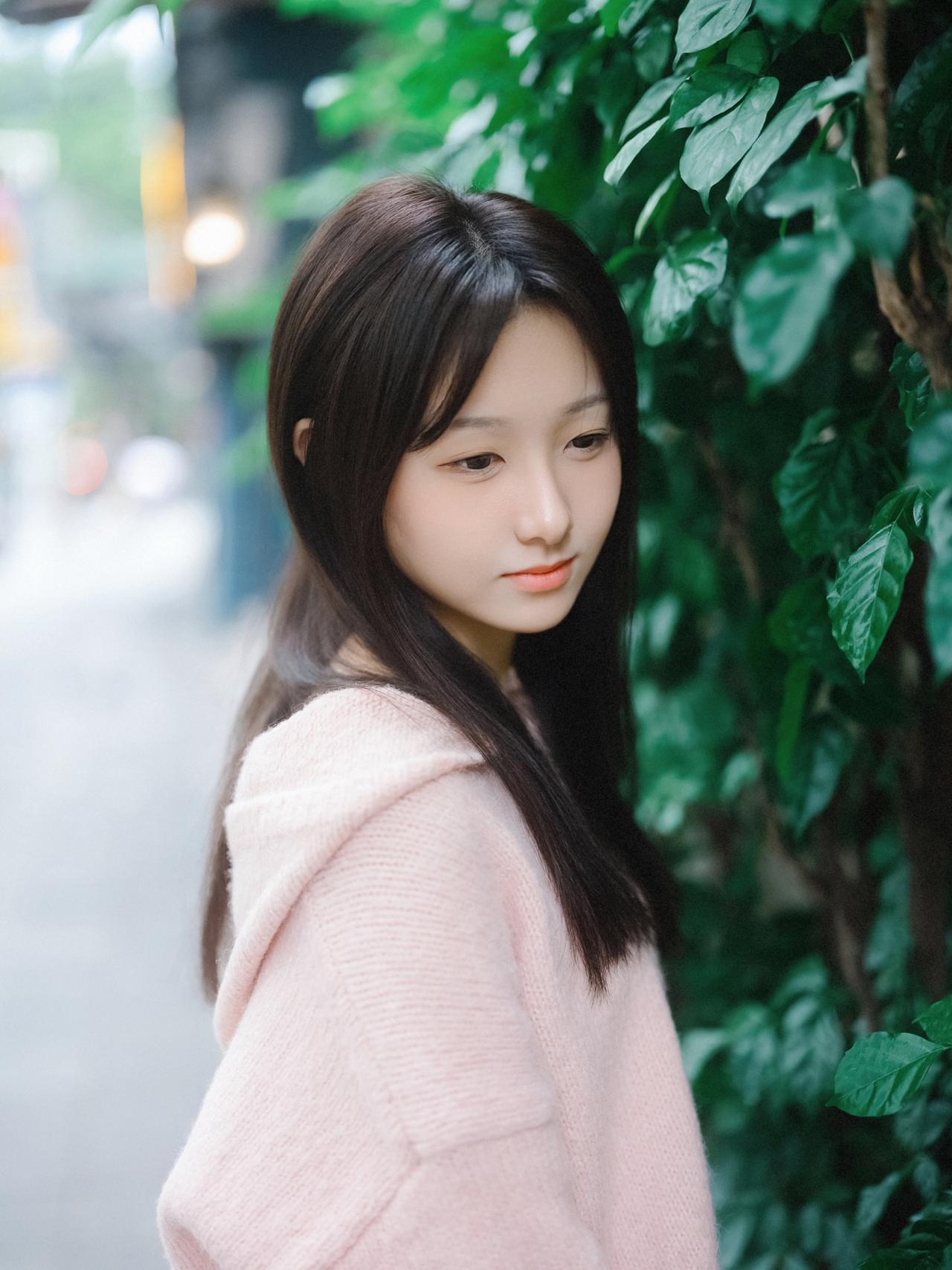 温柔甜美的少女,粉色毛衣与绿植背景相得益彰,尽显青春活力!🌸💕粉色长袖穿搭