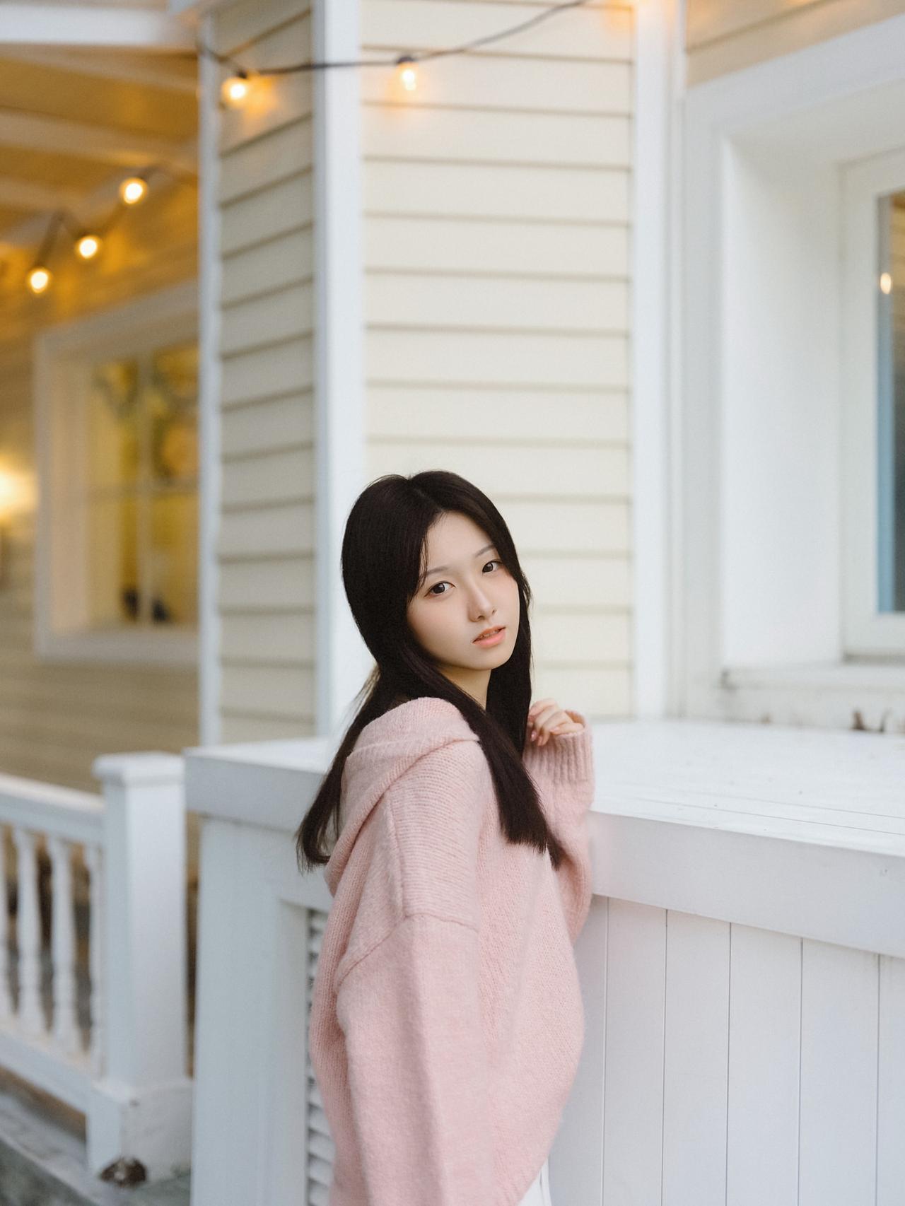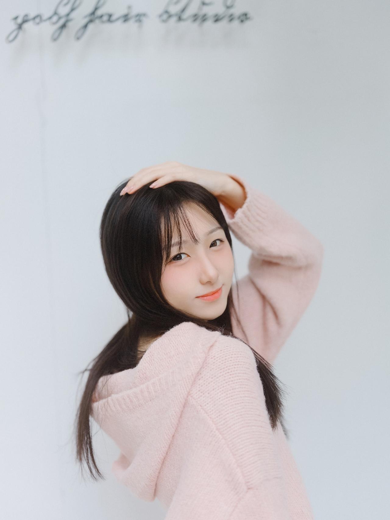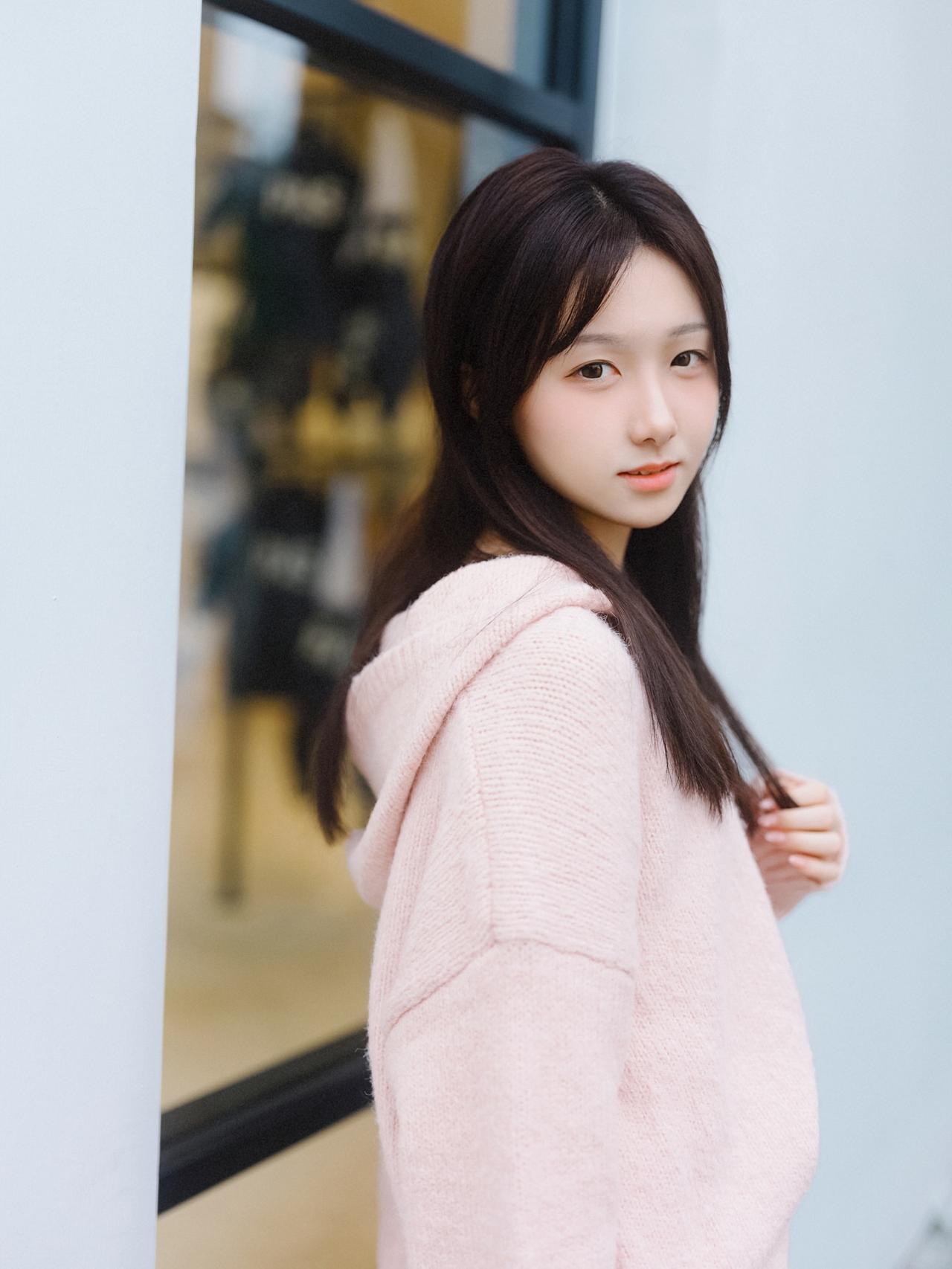 温柔甜美的少女,粉色毛衣与绿植背景相得益彰,尽显青春活力!🌸💕粉色长袖穿搭
