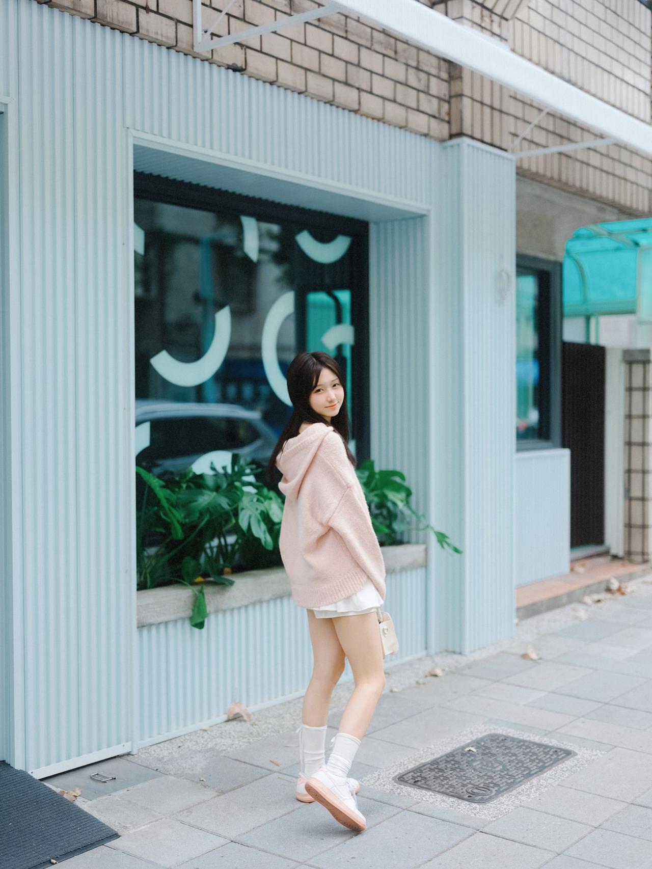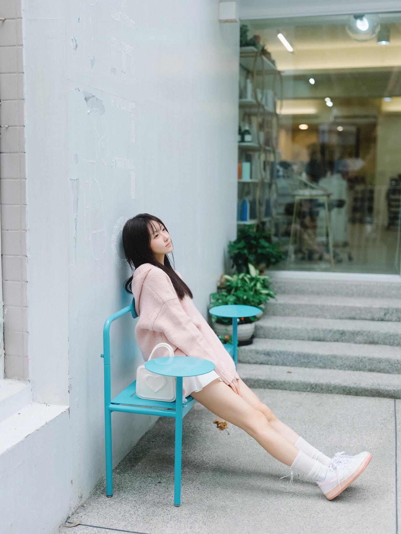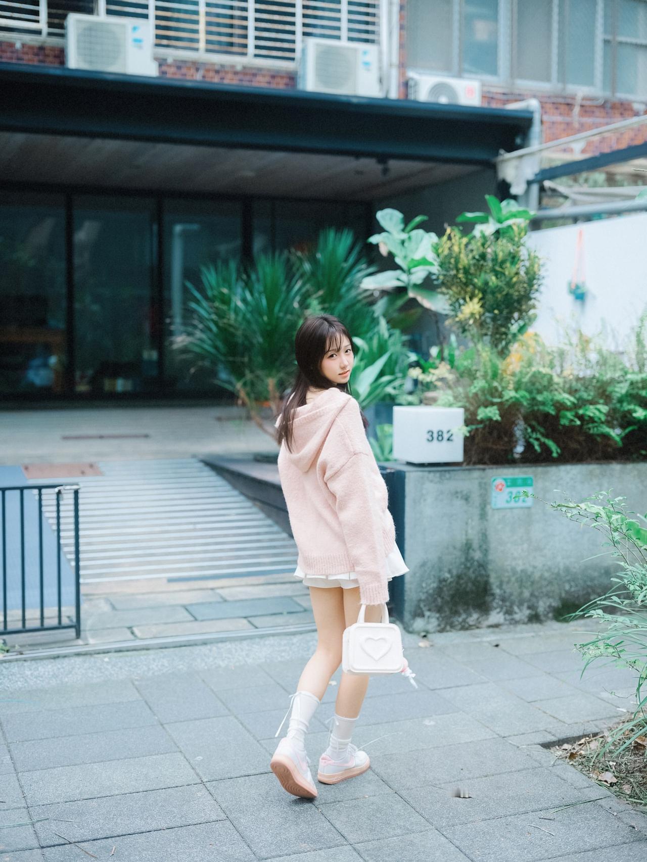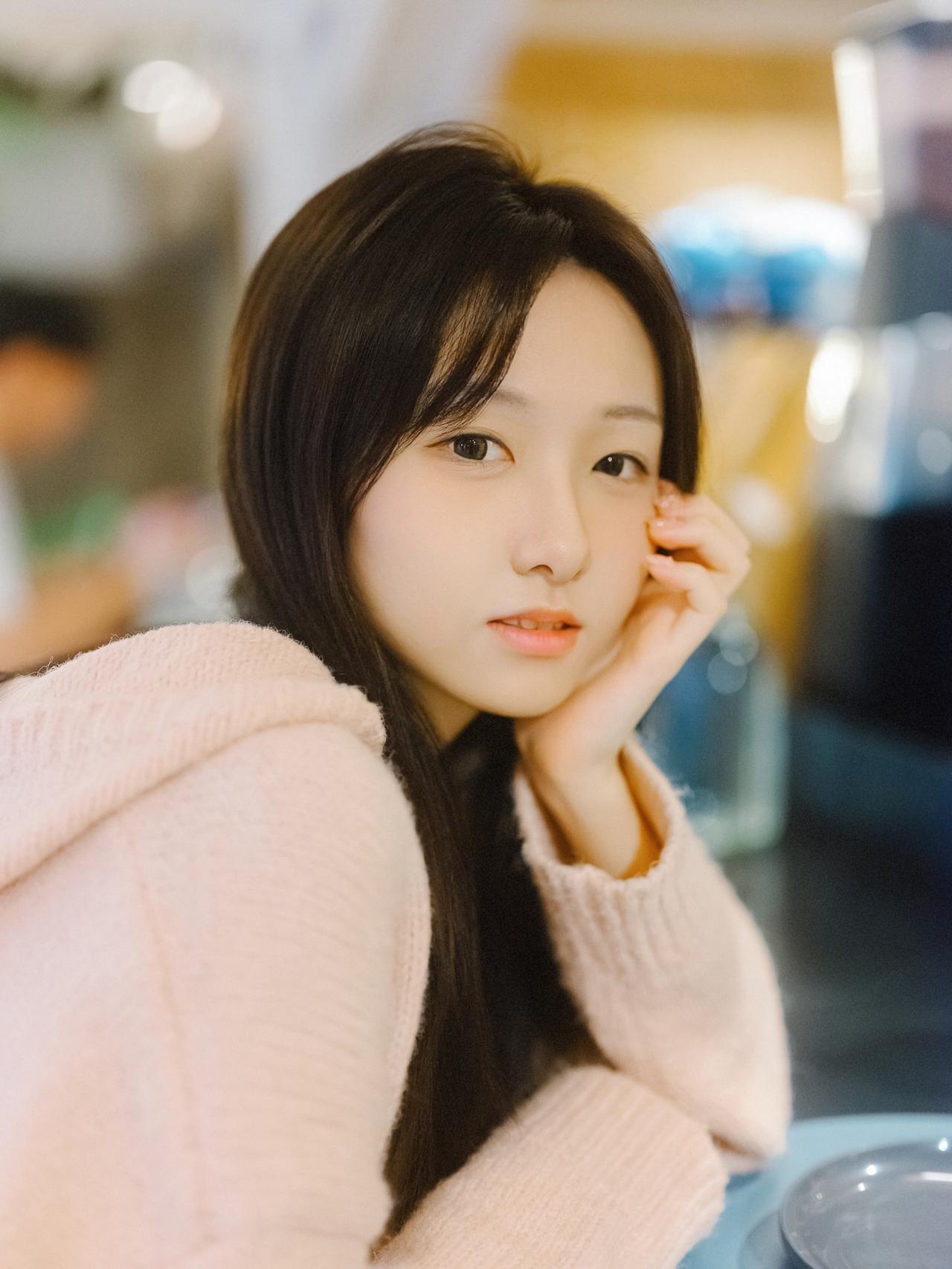 温柔甜美的少女,粉色毛衣与绿植背景相得益彰,尽显青春活力!🌸💕粉色长袖穿搭