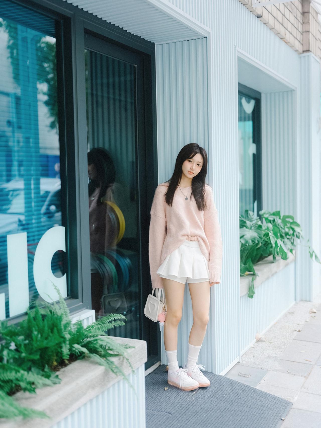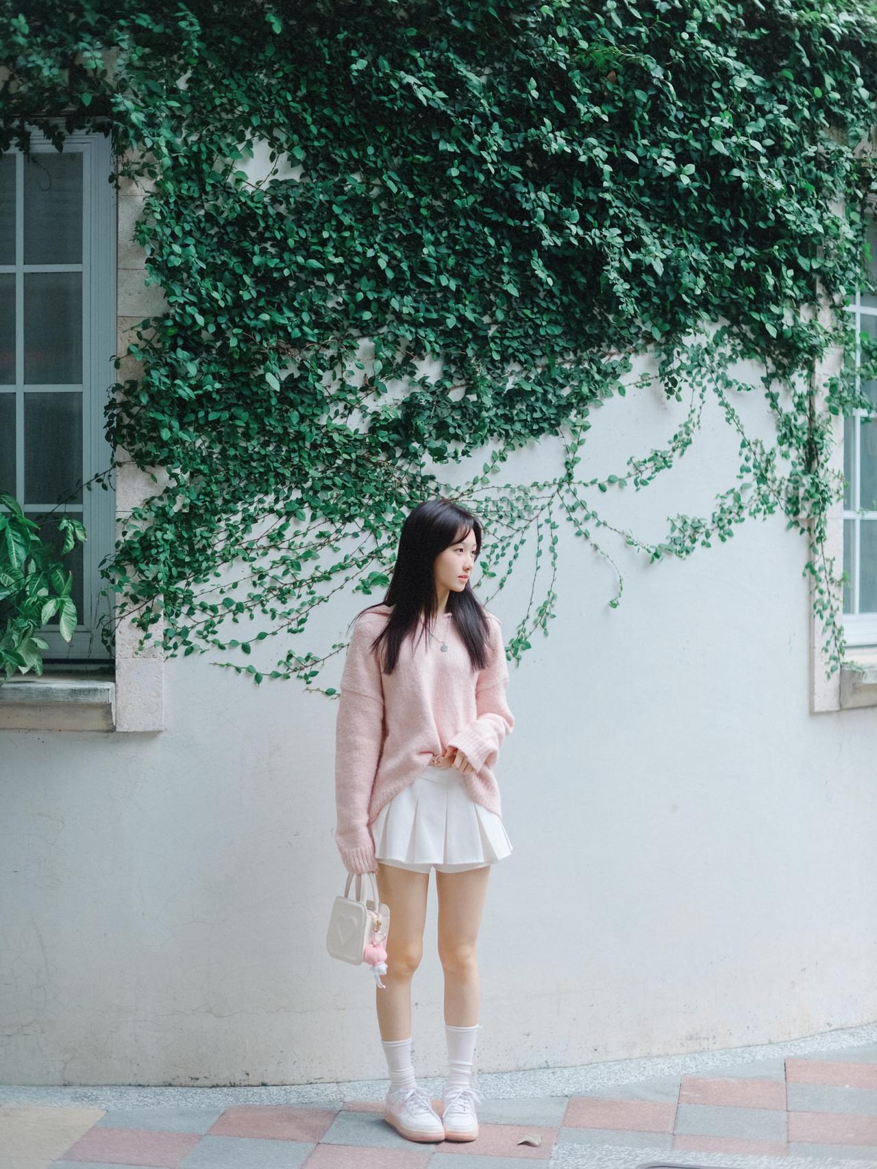 温柔甜美的少女,粉色毛衣与绿植背景相得益彰,尽显青春活力!🌸💕粉色长袖穿搭 淡淡的粉色毛衣 气质穿搭怎么穿才恰到好处?