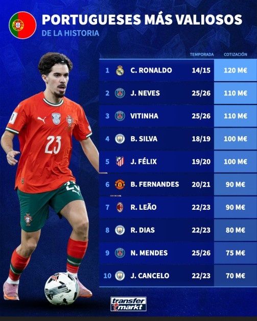 (2)若昂·内维斯-1.1亿欧元(2025/26赛季)