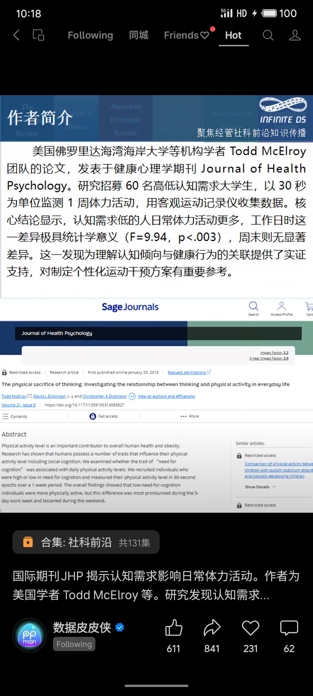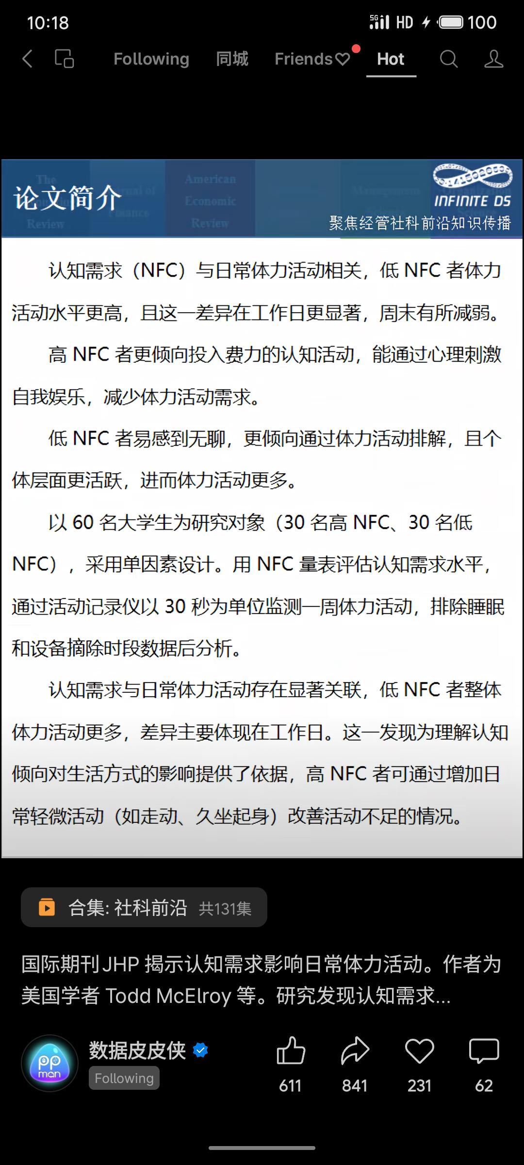 美国学者研究发现,认知需求(NFC)高低与日常体力活动水平显著相关。低NFC者更易感到无聊,倾向通过身体活动排解,故整体活动量更高,此差异在工作日尤为明显。研究提示,个体认知偏好可能隐性塑造其生活方式,对设计促进久坐人群增加活动的个性化方案具有启发意义。
