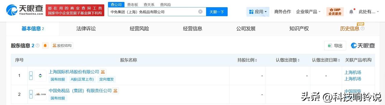 【上海机场、中免集团成立免税品公司 注册资本2亿】 天眼查App显示,近日,中免集团(上海)免税品有限公司成立,法定代表人为杨洪义,注册资本2亿人民币,经营范围含免税商品销售、烟草制品零售、酒类经营、食品销售、信息咨询服务、电子产品销售、通讯设备销售、灯具销售等,由上海机场(600009)、中国免税品(集团)有限责任公司共同持股。 天眼查信息: