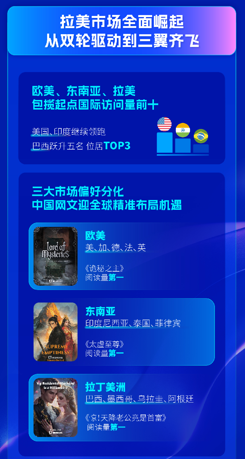 市场格局的深刻变化是今年最大亮点。本年度,长期由北美、欧亚主导的市场版图,因拉丁美洲的“现象级”崛起而被重塑。在WebNovel全球月活用户增速前十名国家中,有九个席位被拉美国家占据。其中,巴西市场以月活779%的增速领跑,其用户访问量也跃升了五位,最终和美国、印度包揽全球前三。