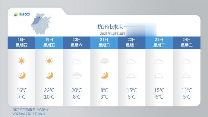 后天(20日)白天依旧是“小阳春”的体感。不过,夜间至周日(21日),受冷暖空气交汇影响,浙北地区将会出现短时小雨天气,偏北风增大,气温明显下跌,全天气温降至10℃以内,预计杭州最高气温直接由20℃暴跌至8℃,降温幅度达10℃以上,体感明显变冷。