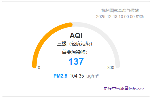 受上游地区污染物输入和不利的扩散条件影响,今天上午杭州空气质量较差,上午10时,杭州站测得的AQI指数达轻度污染级别,部分区县中度污染。