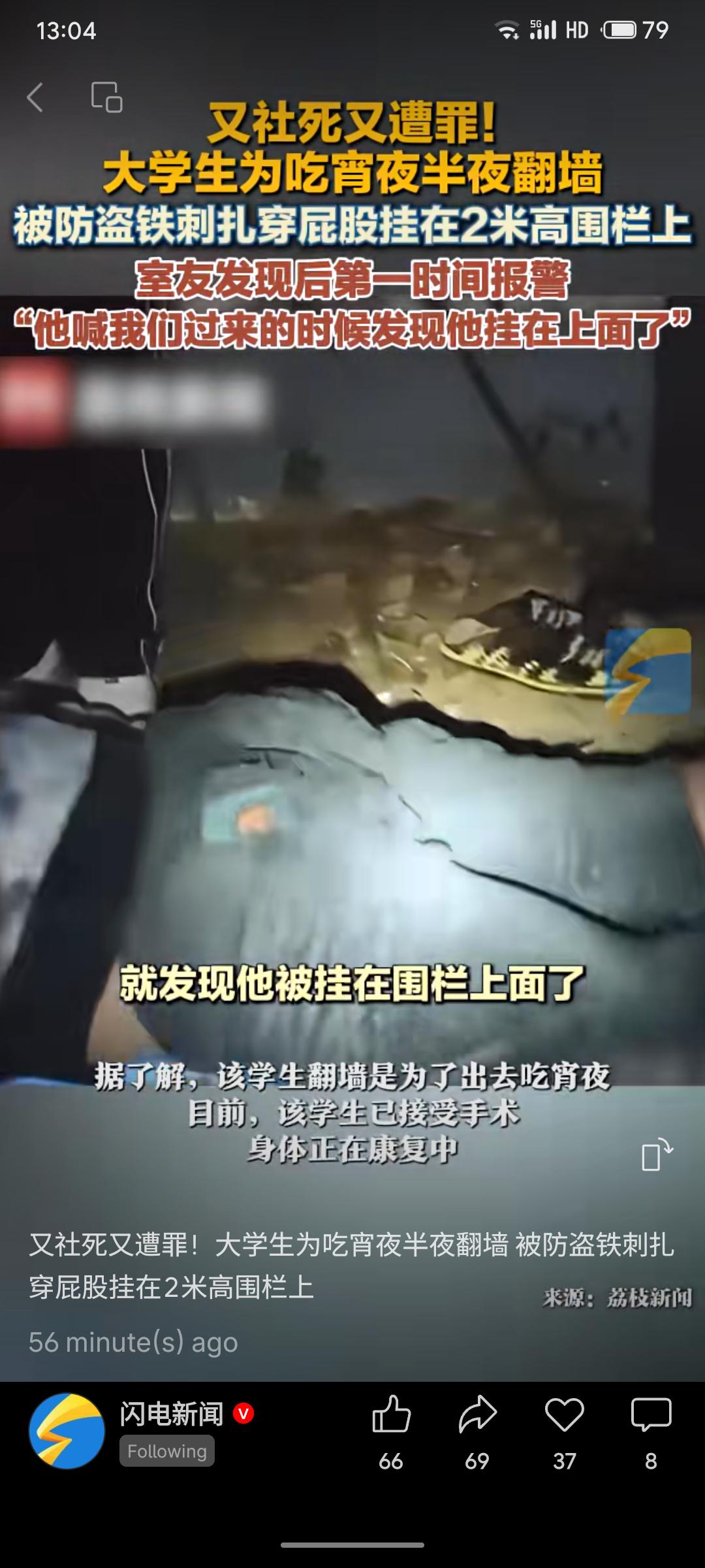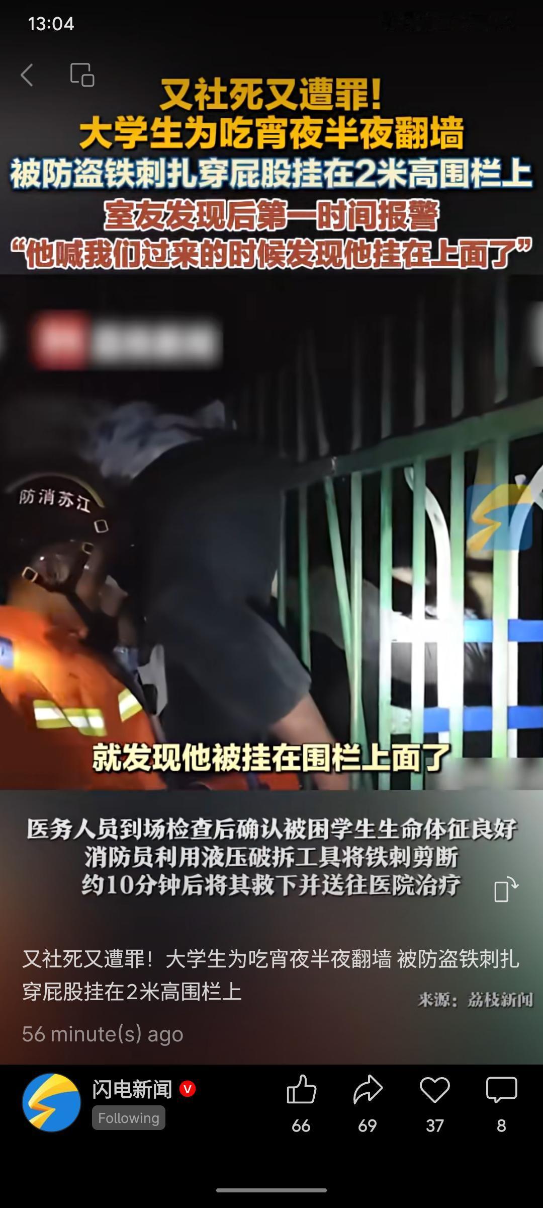 晒图笔记大赛大学生为吃宵夜深夜翻墙,被围栏铁刺扎穿臀部,悬挂近两米高处。室友报警后由消防员破拆救下。此事既暴露学生安全意识薄弱、校规执行存隙,也反映出校园管理与学生需求间的矛盾。一次侥幸的违规换来自身伤痛与“社死”窘境,警示深刻。