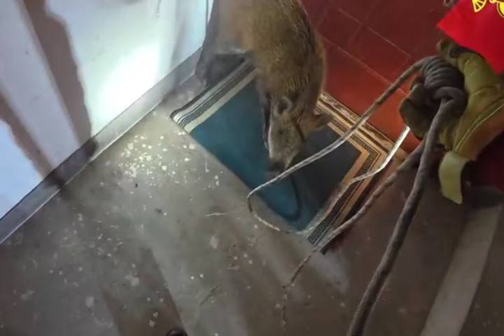 见状,消防队员迅速调整战术,凭借对楼道结构的快速判断,预判其逃跑路线并提前封堵,4名消防队员一拥而上最终在6楼楼梯以上将野猪再次合围。面对野猪的激烈反抗,消防队员瞅准时机,果断扑上前按住其头部,另一名队员迅速控制住野猪四肢,其余人员默契配合,用绳索牢牢捆绑住野猪的躯干和腿部,整个抓捕过程紧张有序,仅用5分钟便成功将这头“不速之客”制服,并用绳索牢牢绑住抬下楼。