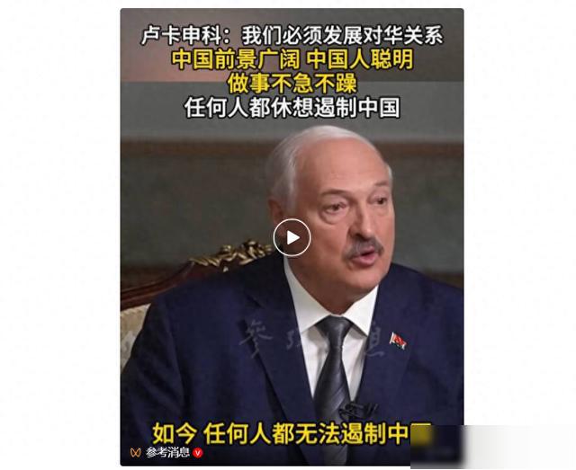 报道称,卢卡申科说:“我第一次去中国还是30多年前,当时我就在议会中发言:‘我们必须与中国发展关系,那里有广阔的前景’……你们(美国)试图遏制中国,因此至少浪费了20年。如今,任何人都无法遏制中国。”