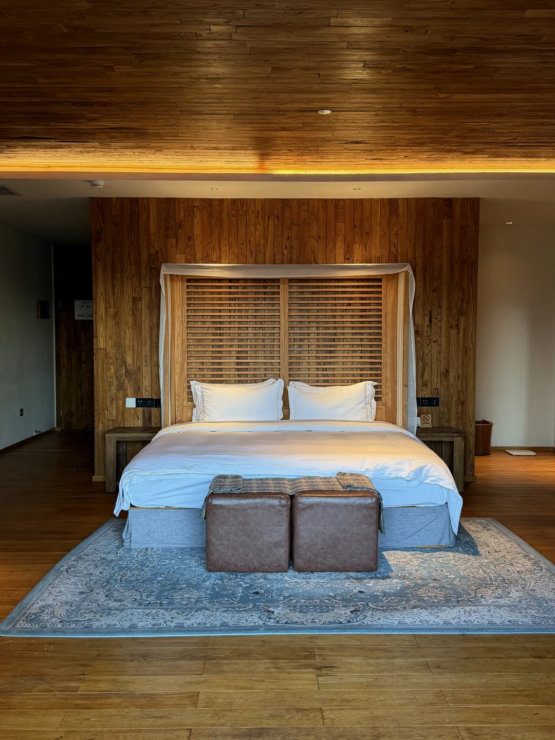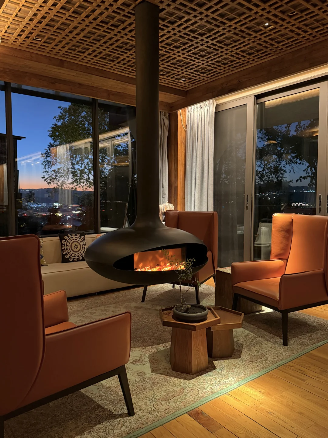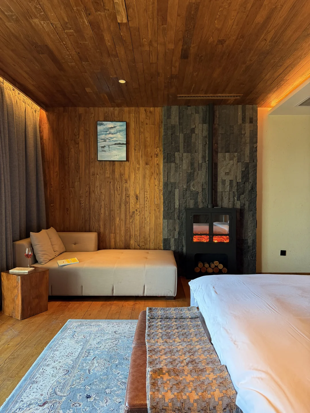 木质调的房间大大的暖暖的,打开壁炉,就拥有了家一般的温馨氛围,没想到的是,连温泉泡池和浴室都是用火山石打造的,阳台落地窗就是一个巨大的取景框,早上打开窗户就能闻到清新松枝的味道,大自然爱好者超爱🌲我想我有了再来腾冲的理由🤍