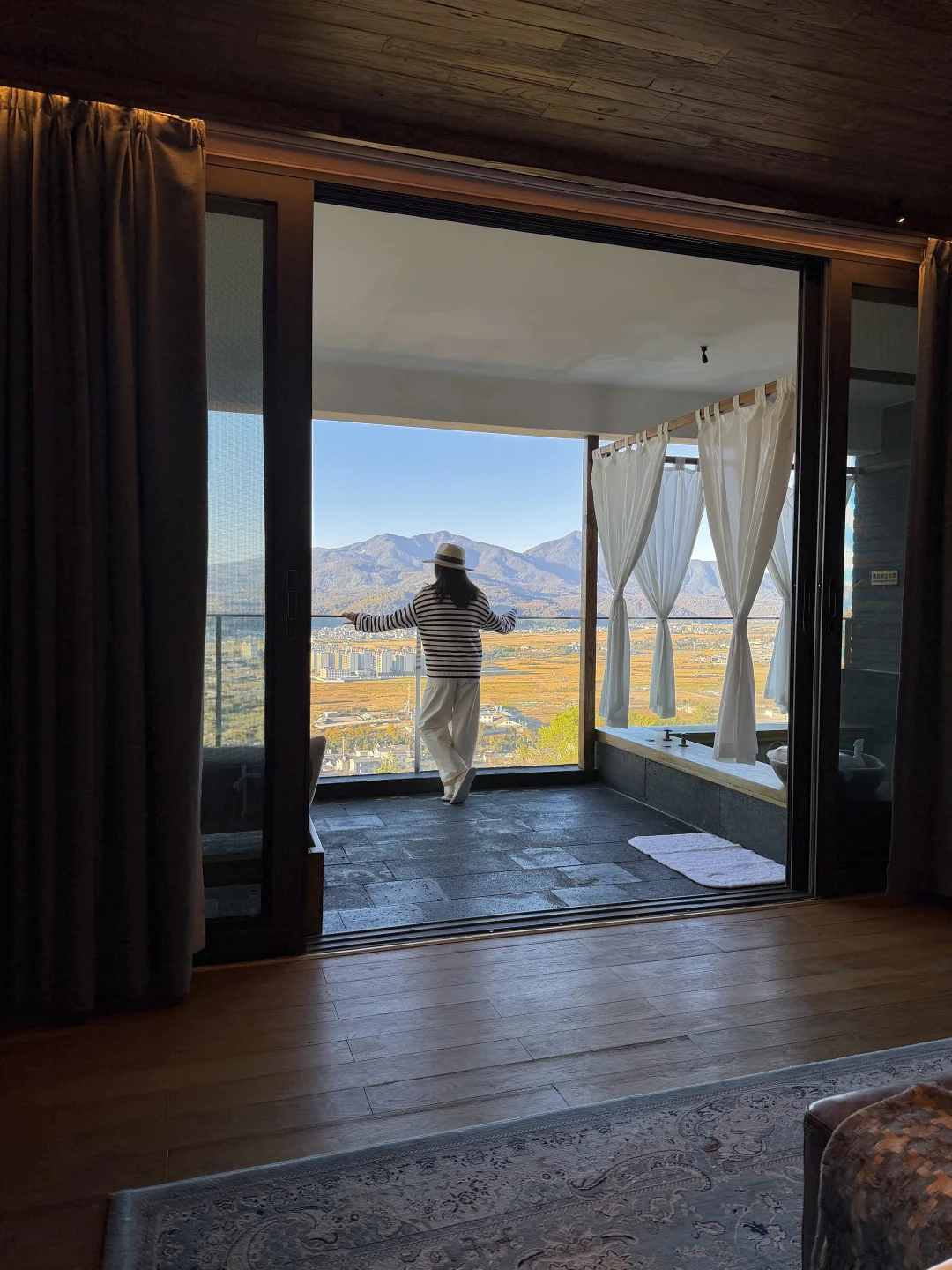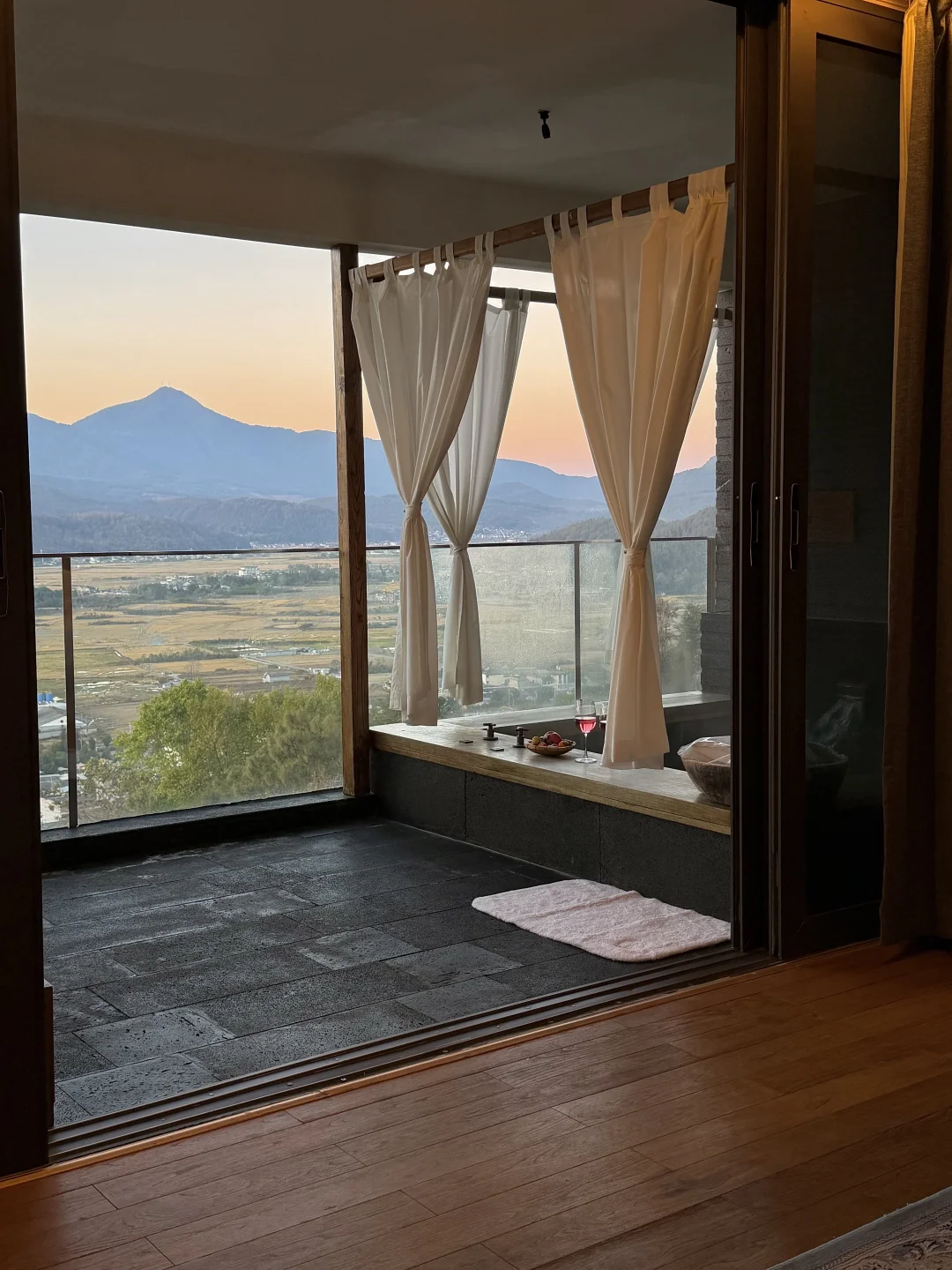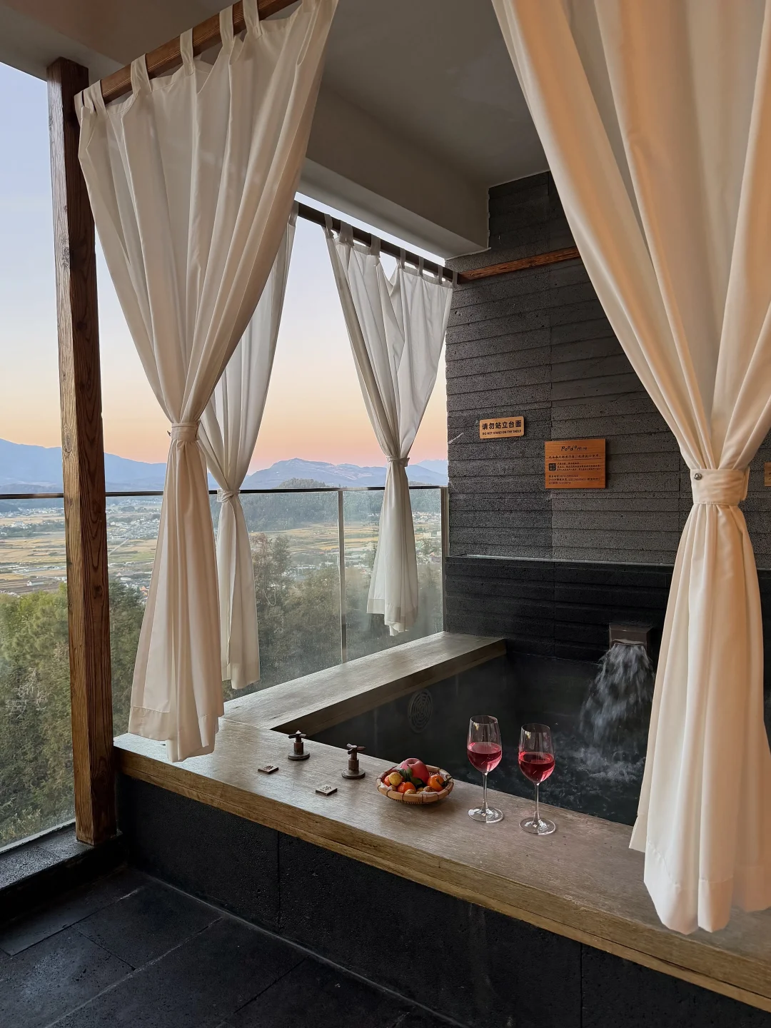 特地选了高黎贡半山上的温泉酒店,远离喧嚣,更有度假的感觉〰️打开房间的一瞬间就被窗外的风景吸引住,远处的火山群🌋,近处的欧式小镇🏡都尽收眼底,特别是傍晚时分,打开音响听着音乐,在房间边欣赏落日边泡天然私汤♨️,超chill!