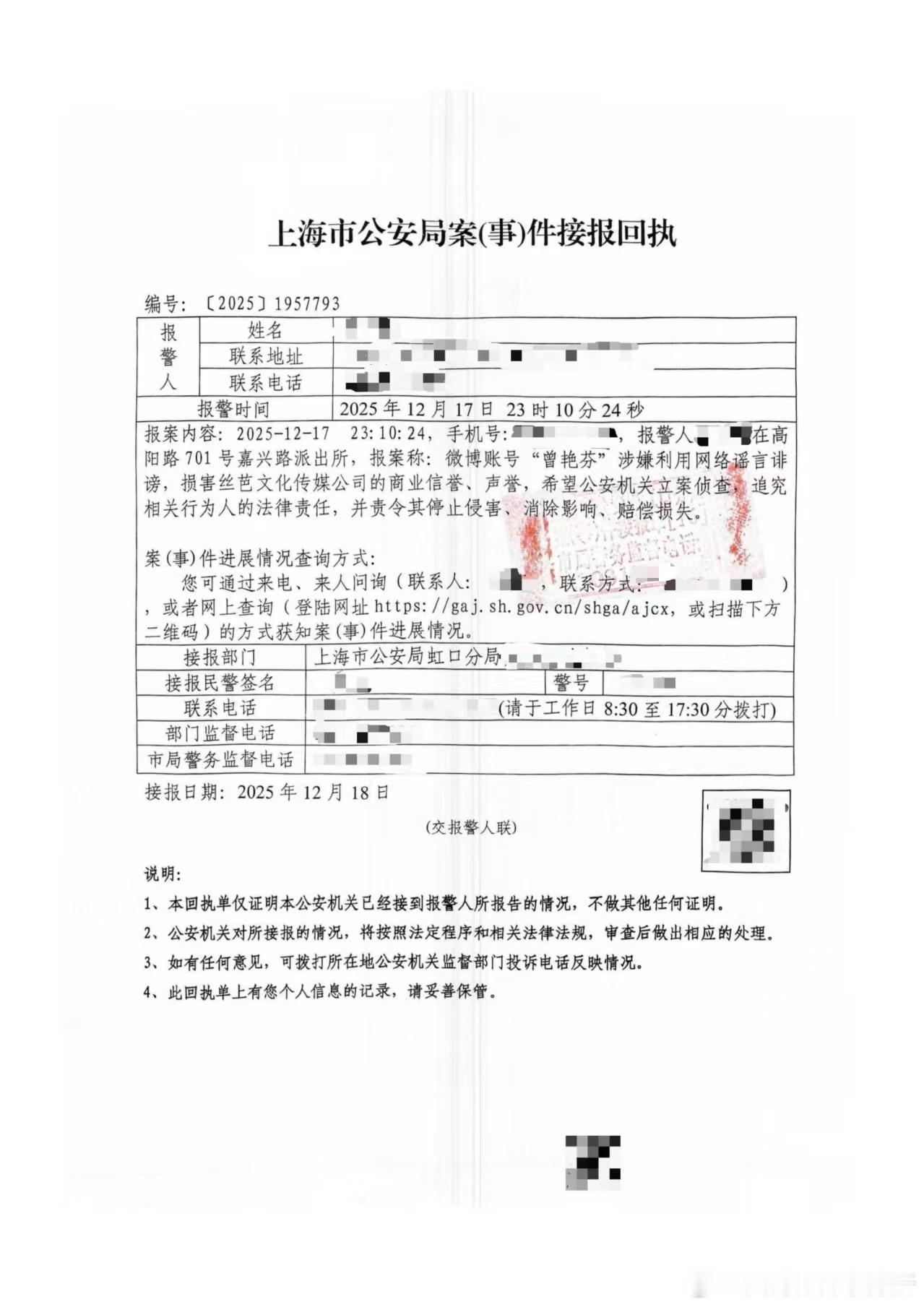 丝芭方发报警回执丝芭传媒维权声明 丝芭方针对曾艳芬微博引发的“陪酒”争议发布维权声明及报警回执。