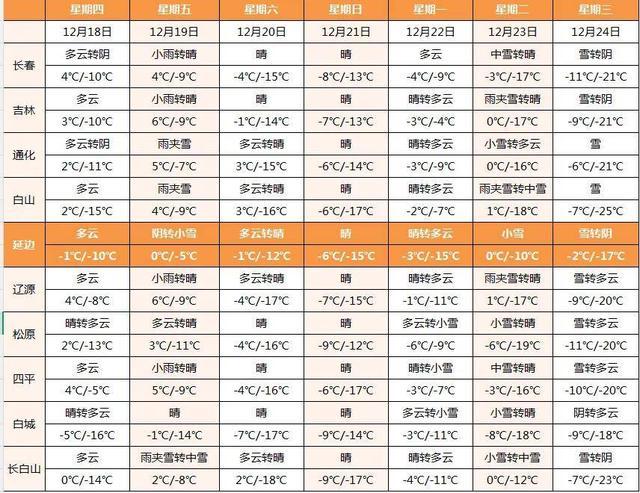 18日夜间到19日白天,长春、四平中东部、辽源、吉林市、通化、白山北部和西部、延边州西部、长白山保护开发区有雨夹雪或小雪,部分地方有中到大雪。