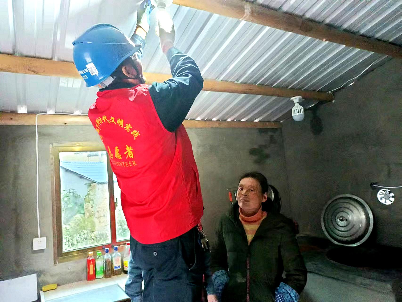 陈维冲夫妇因身体残疾行动不便,家中线路使用年限较长,部分线路老化裸露、灯泡坏损,不仅影响正常照明,更存在极大用电安全隐患。党员服务队队员们提前了解情况后,带着绝缘导线、开关、节能灯泡等物资来到夫妇家中,分工协作开展帮扶工作。