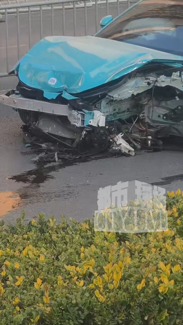 现场视频显示,涉事小米汽车的车头受损严重,零件多处破损,电机外露,驾驶侧前轮已不翼而飞。事故还导致多段护栏被撞毁,散落在路面上。