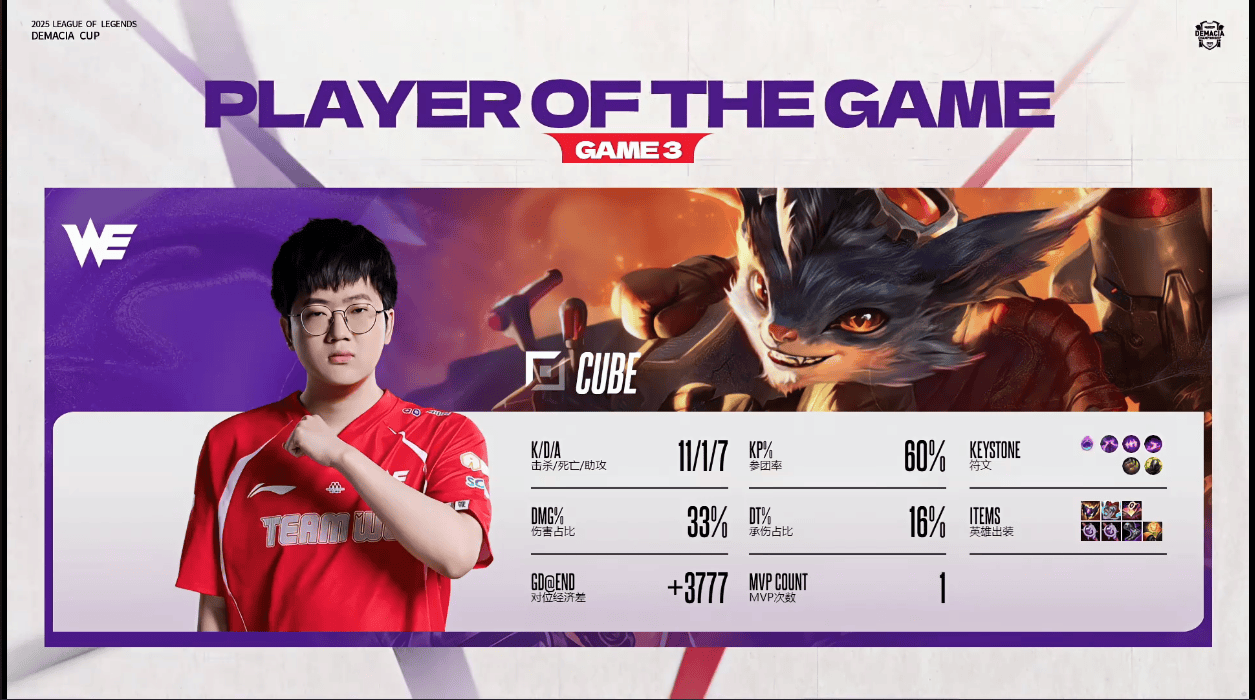 Cube兰博打出11/1/7战绩,斩获WE对阵UP第三局MVP