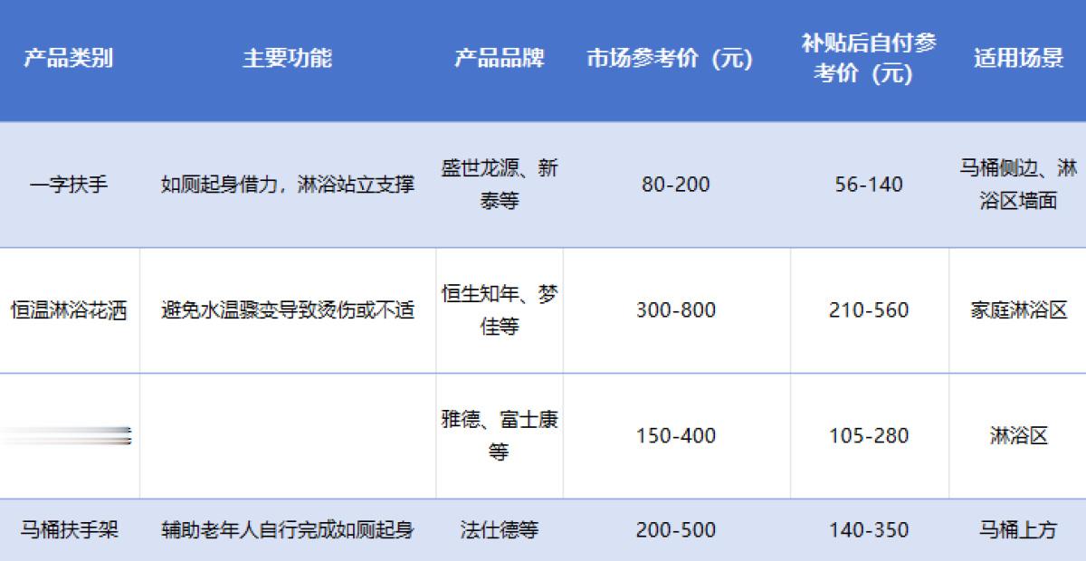 注:1.产品价格仅供参考,实际市场价格可能因品牌、材质、规格等因素有所波动,请以采购时实际报价为准;2.自付金额按市场参考价享受30%政府补贴后估算,即自付价≈市场价×70%;3.具体可选用产品型号及补贴细则,请以官方发布的清单为准。