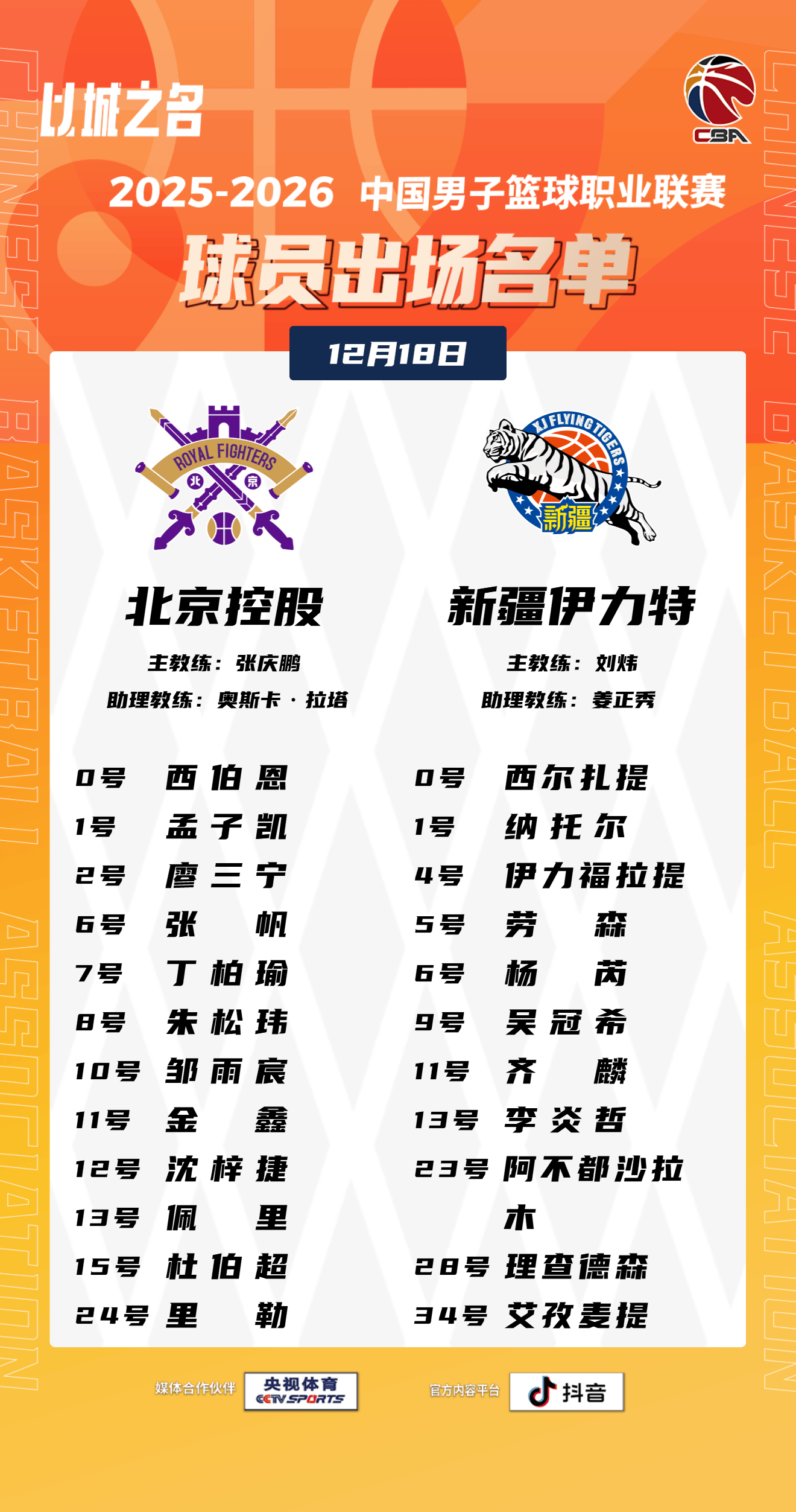 虎扑12月18日讯今日CBA常规赛,北控对阵新疆的大名单已经公布。