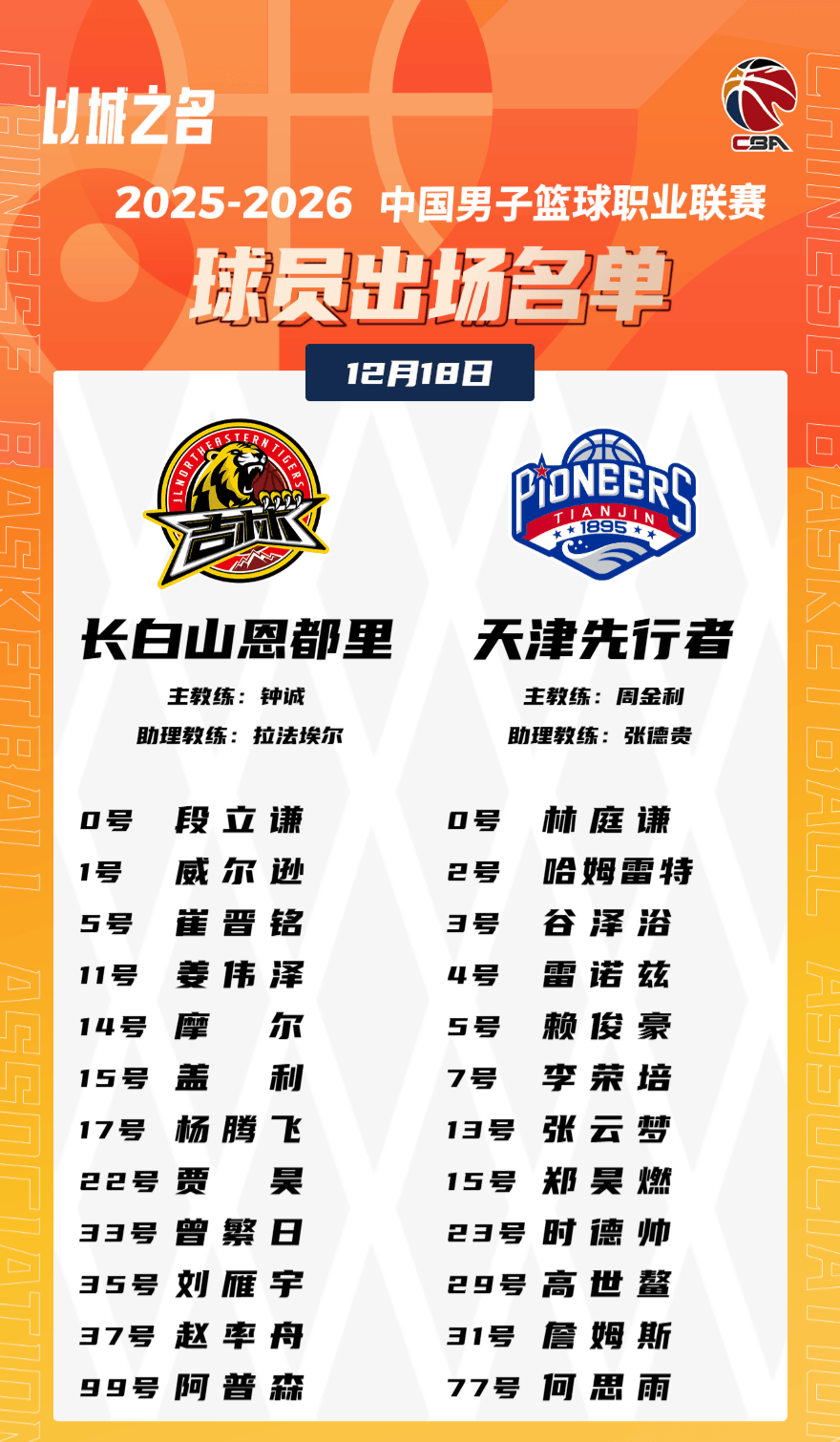 虎扑12月18日讯今日CBA常规赛,吉林对阵天津的大名单已经公布。