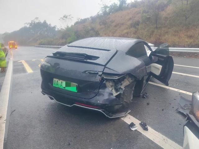 当天16时10分许,来宾市公安局交通管理支队高速公路二大队接到报警后,立即赶往现场进行处置。只见事故现场一片狼藉,车牌号为粤AAT***2的黑色小型轿车斜停在快车道上,车头车尾严重变形,右后轮直接脱落,车内安全气囊全部炸开;车牌号为冀F0***Z的白色小型普通客车紧紧贴在黑色小型轿车右后侧,车头受损严重,路面上散落着两车碰撞后的碎片、零件。
