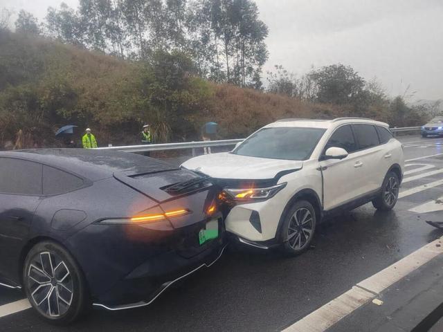 雨天行车,减速慢行是关键。12月12日,在G6517梧柳高速象州段,一辆黑色小车就因雨天冒险超车导致车辆失控碰撞护栏,而被超的车辆因避让不及随后撞上黑色小车,万幸的是车上人员都按规定使用了安全带,仅一人受轻微伤。