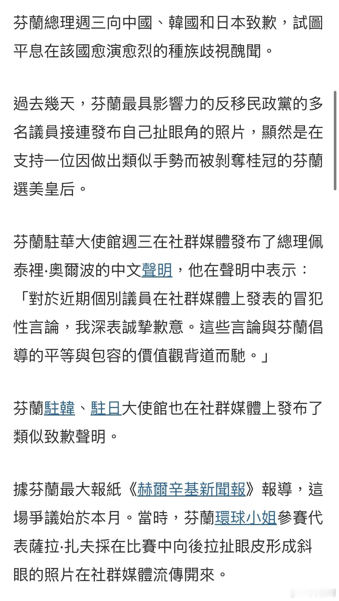 芬兰总理就选美皇后和议员种族歧视事件向中、日、韩道歉芬兰总理正式道歉热点观点
