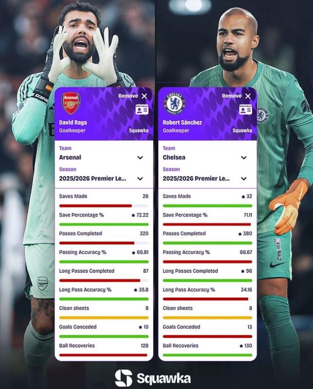 Squawka对比拉亚与桑切斯在本赛季至今英超联赛中的各项数据(拉亚在前):