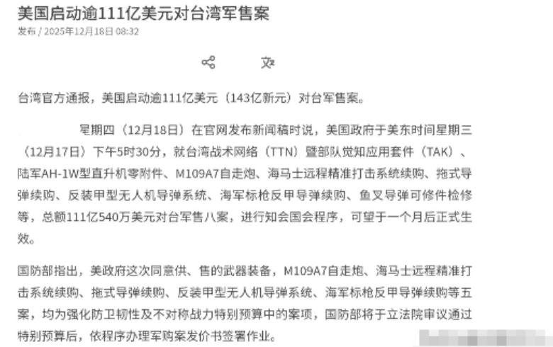 事情严重了!中国取消美国的订单!若美国没有意识到事态的严重性,弄不好我们会有更大动作!12月18日,根据外媒报道,中美关系刚趋于稳定之后,美国又在台湾问题上做文章了。外媒称,美国将启动逾111亿美元对台军售案。这一军售案销售的军品包括M109A7自走炮、海马士远程精准打击系统续购、拖式导弹续购、反装甲型无人机导弹系统、海军标枪反甲导弹续购、鱼叉导弹等等。   此次美国对台军售清单,恰似一份蓄意炮制、饱含恶意的“战争菜单”,其中,M109A7自走炮为地面作战“利器”,兼具强大火力与卓越机动性,其心可诛。   一旦被部署到台湾,将极大地增强台军的地面作战能力,让台军在所谓的“防卫”中更具“底气”。   海马士远程精准打击系统的再度采购,着实引人警觉,此系统威力不容小觑,其续购之举背后或藏深意,需我们保持高度的关注与警惕。   其具备远射程与高精度,恰似高悬头顶的“达摩克利斯之剑”,台军妄图借此在台海局势中打造“远程打击优势”,不过是痴人说梦,还对解放军作战行动形成潜在威胁。   拖式导弹续购与反装甲型无人机导弹系统,针对性堪称极致,其目标明确指向解放军装甲力量与空中优势,妄图构建反制防线,以此干扰解放军有序的作战节奏。   而海军标枪反甲导弹续购、鱼叉导弹,则将矛头指向了解放军的海上与登陆作战力量,其野心昭然若揭。   美国此举,绝非简单的军火交易,而是其“以台制华”战略的又一次疯狂实践。   美国妄图以武装台湾之卑劣行径,将其打造成遏制中国崛起的前沿堡垒,借台湾问题掣肘中国,干扰发展进程,这般居心叵测、用心险恶,着实令人发指。   此等行径,公然违背一个中国原则与中美三个联合公报之规定,是对中国主权与领土完整的肆意侵犯,更是对国际法及国际关系基本准则的悍然亵渎,令人愤慨。   面对美国这般恶劣行径,中国即刻作出强硬且掷地有声的回应,取消部分美国订单之举,仅是中国反制的开篇之章,后续动作或更具雷霆之势。   这一举措,不仅是对美国经济上的一次有力回击,让美国为其错误行径付出一定的经济代价,更是向世界表明了中国捍卫国家核心利益的坚定决心。   在国际舞台之上,中国始终秉持和平发展、合作共赢之理念,积极投身于人类命运共同体之构建,然而,这绝不意味着中国会在原则问题面前妥协让步,彰显大国坚守与担当。   台湾是中国领土不可分割的一部分,这是国际社会公认的事实,也是中国不可动摇的核心利益。   美国在台湾问题上蓄意挑衅,严重侵犯中国主权,捍卫国家主权与领土完整乃中国的神圣权利与庄严义务,中国必将采取一切必要举措,坚定维护自身核心利益。   美国此次对台军售,背后隐藏着其深深的霸权焦虑,随着中国综合国力的不断提升,中国在国际舞台上的影响力日益增强,美国在全球的霸权地位受到了前所未有的挑战。   为维系那岌岌可危的霸权之位,美国不择手段地对中国进行打压,在诸多遏制行径里,台湾问题沦为其手中至关重要的“筹码”,被肆意操弄。   然而,美国这种战略误判无疑是在玩火自焚,中国的发展是不可阻挡的历史潮流,这是任何力量都无法改变的事实,任何试图阻挡中国前进的企图,都注定会以失败告终。   美国于台湾问题上蓄意挑衅,妄图遏制中国崛起,实则徒劳,此举非但不能得逞,反倒会加速自身霸权衰落,中美身为世界大国,合作方能互利共赢,对抗只会两败俱伤。   美国当明晰时势,摒弃冷战思维与零和博弈之念,即刻停止在台湾问题上的错误之举,莫再执迷不悟,应回归以对话协商化解分歧的正道坦途。   美国此番对台军售之举,无疑是对中美关系底线的公然冒犯与挑衅,更是对地区和平稳定的严重戕害,其行径无视国际关系准则,危害深远。   中国取消美国订单,此乃反制开篇之举,若美国依旧执迷不悟、刚愎自用,中国定会祭出更强有力之策,使其为自身错误行径付出惨痛代价,以正国际秩序之纲纪。   美国当清醒认知,台湾问题乃中国核心利益之核心,是不可触碰的红线,此系中国主权与领土完整之关键所在,容不得任何外部势力染指与干涉。   中美两国当秉持相互尊重、平等互利之原则,强化沟通协作,携手推动人类命运共同体之构建,以积极姿态为世界和平与发展添砖加瓦,贡献力量。   美国应摒弃在台湾问题上的玩火之举,莫将两国关系拖入危险深渊,望其悬崖勒马,停止错误行径,若执迷不悟,必将自食恶果,陷入万劫不复之境。