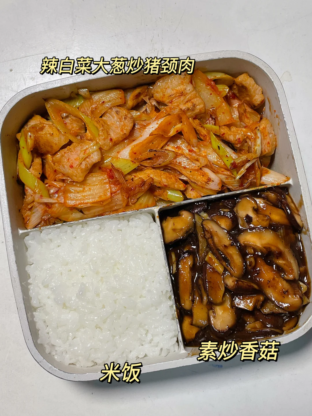 📍米饭+辣白菜大葱炒猪颈肉+炒香菇