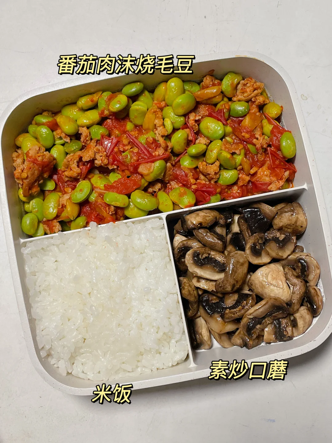 📍米饭+番茄肉沫烧毛豆+炒口蘑