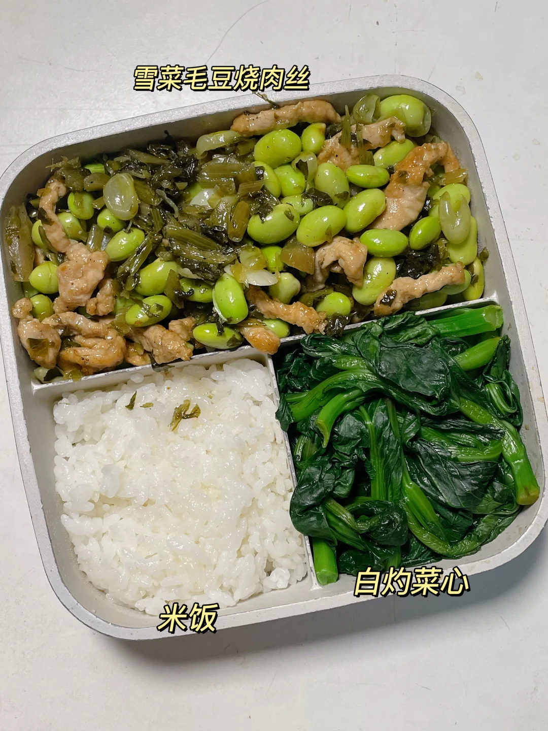 📍米饭+雪菜毛豆肉丝+白灼菜心