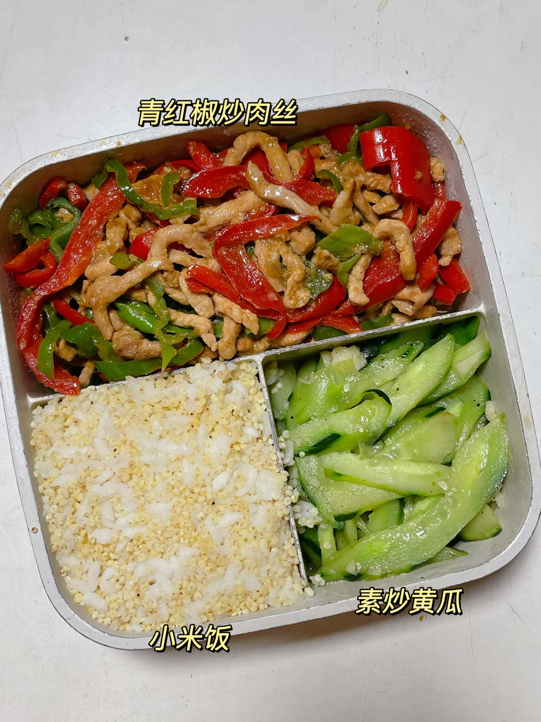 📍小米饭+青红椒炒肉丝+炒黄瓜