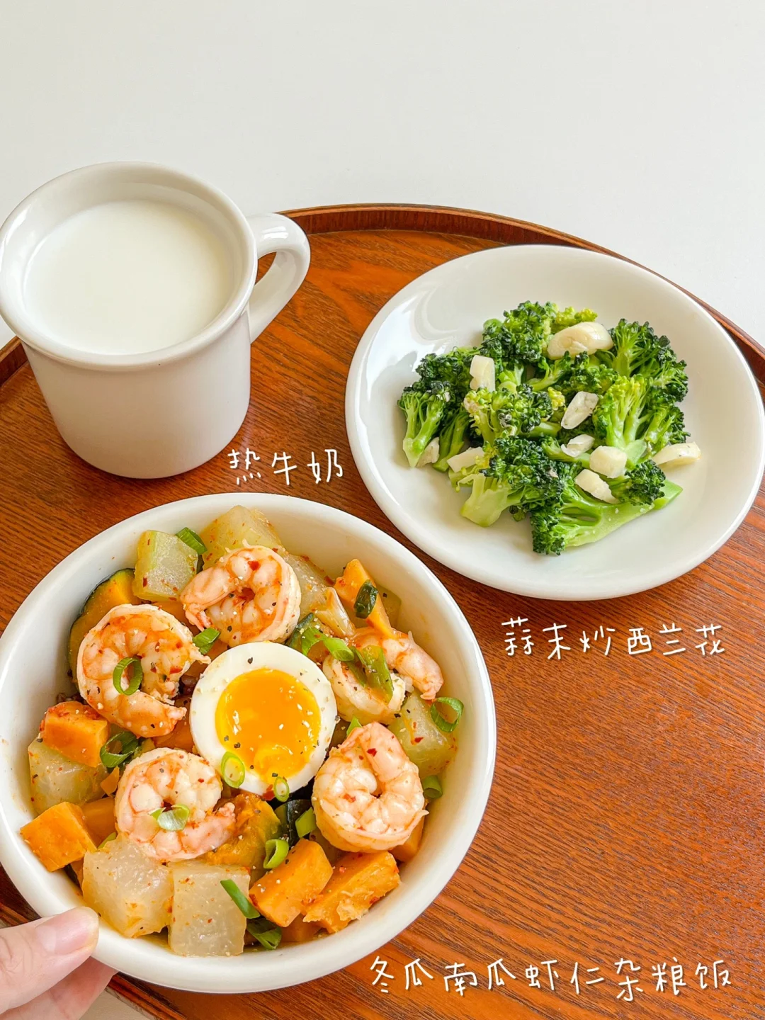 “精简饮食几个月以来,身体觉得更加舒适,特别是觉得身体的负担变轻了,人更精神了。” 今日午餐: ¹冬瓜南瓜虾仁杂粮饭 ²蒜末炒西兰花 ³热牛奶 我每周至少吃2-3次鱼虾类的水产 大概500克左右 可以作为平时健康饮食的一项指标[派对R] 淡水鱼、深海鱼、虾蟹、贝类换着吃 买鱼我通常是买整条 刀鱼会分好每餐的量 三文鱼、鳕鱼每次150克左右 蒸或烤一下就很好吃