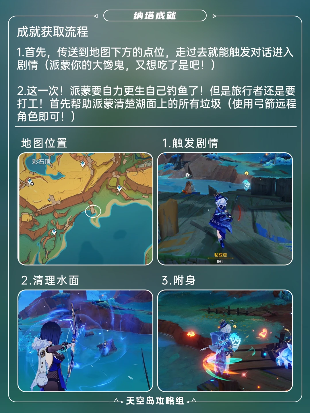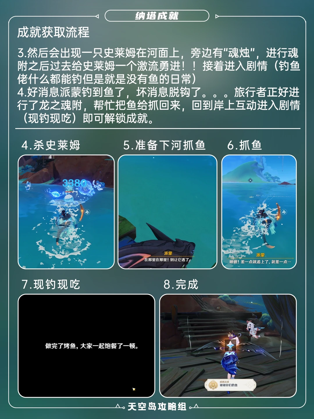 本次带来的是纳塔新增成就「谢谢你们的鱼」[哇R] 1⃣️传送至彩石顶右下方(见p2) 2⃣️触发世界任务「今天是吃鱼的心情!」 3⃣️清理水上杂物后进入剧情 4⃣️魂附抓鱼后解锁成就[哇R]