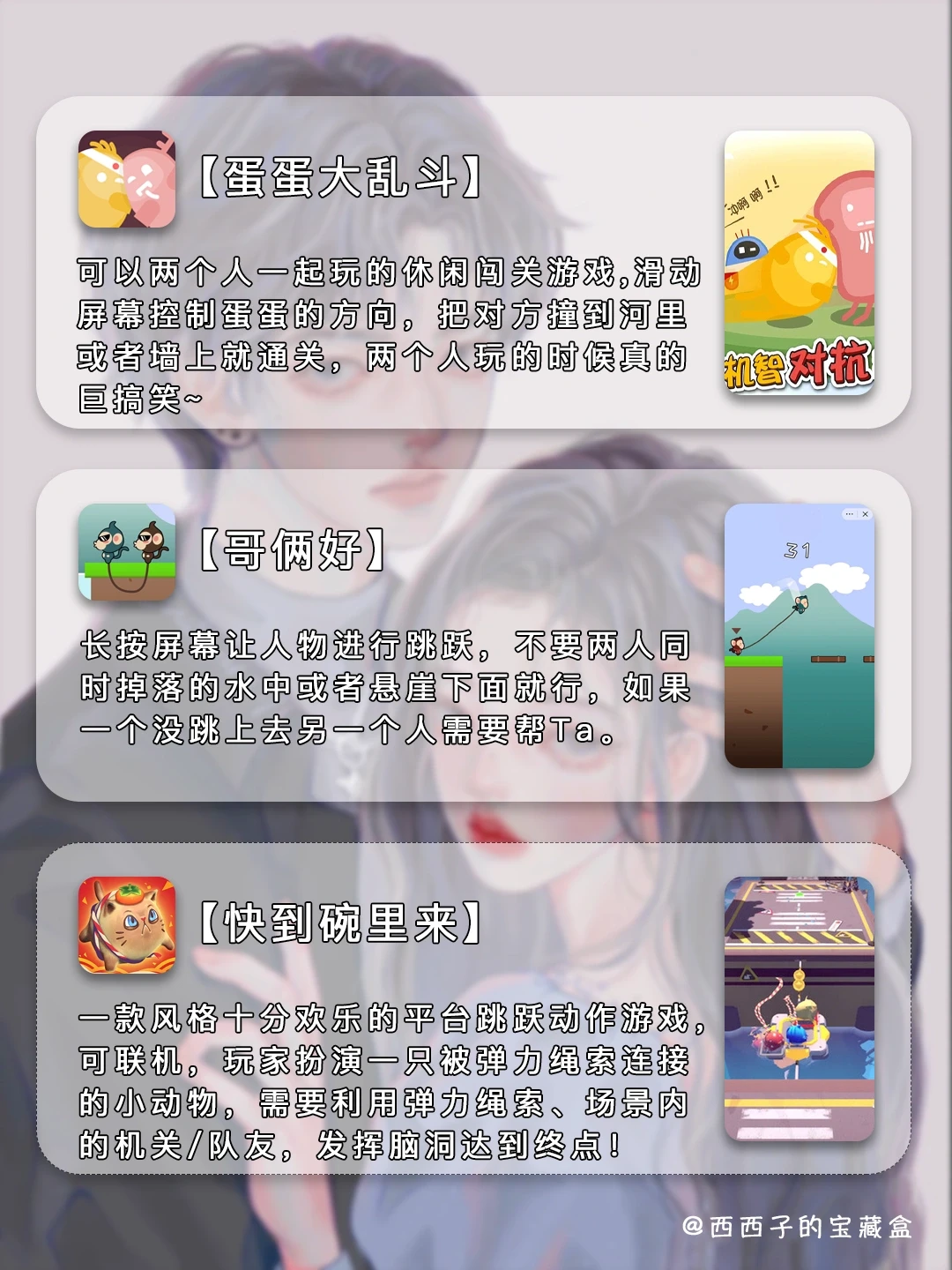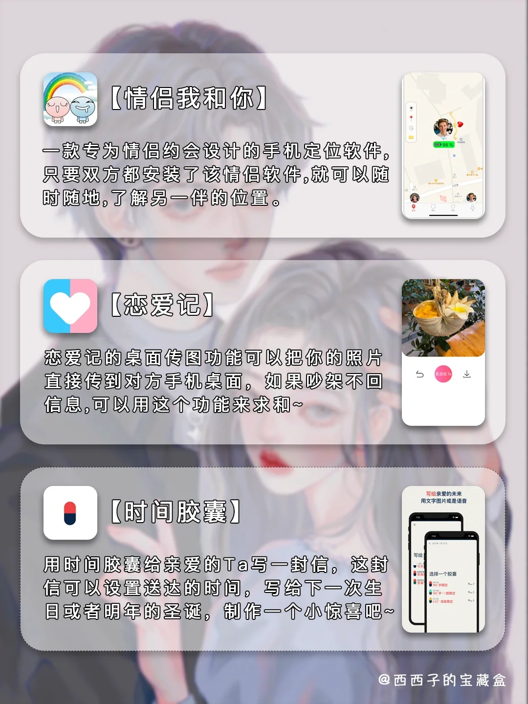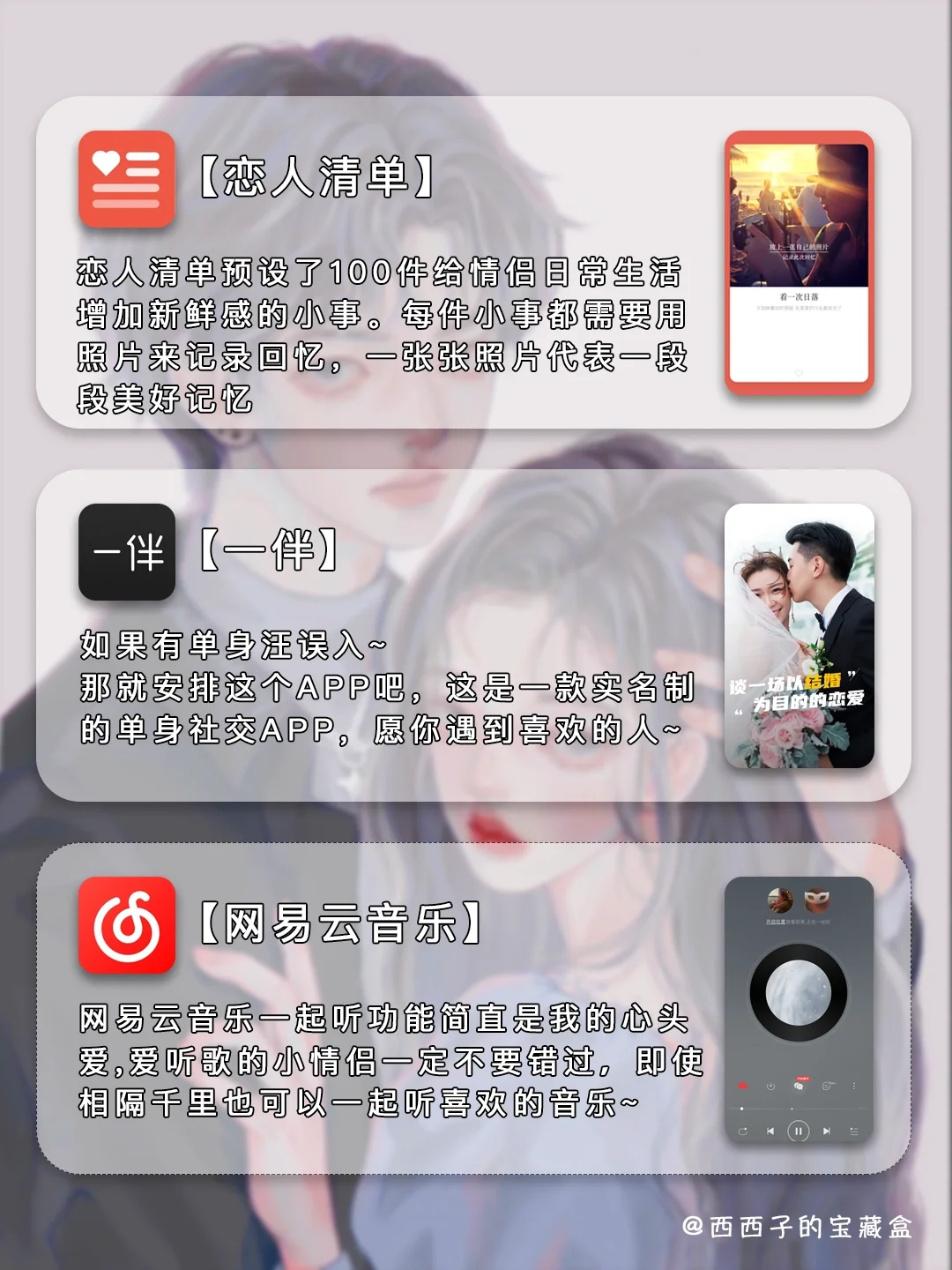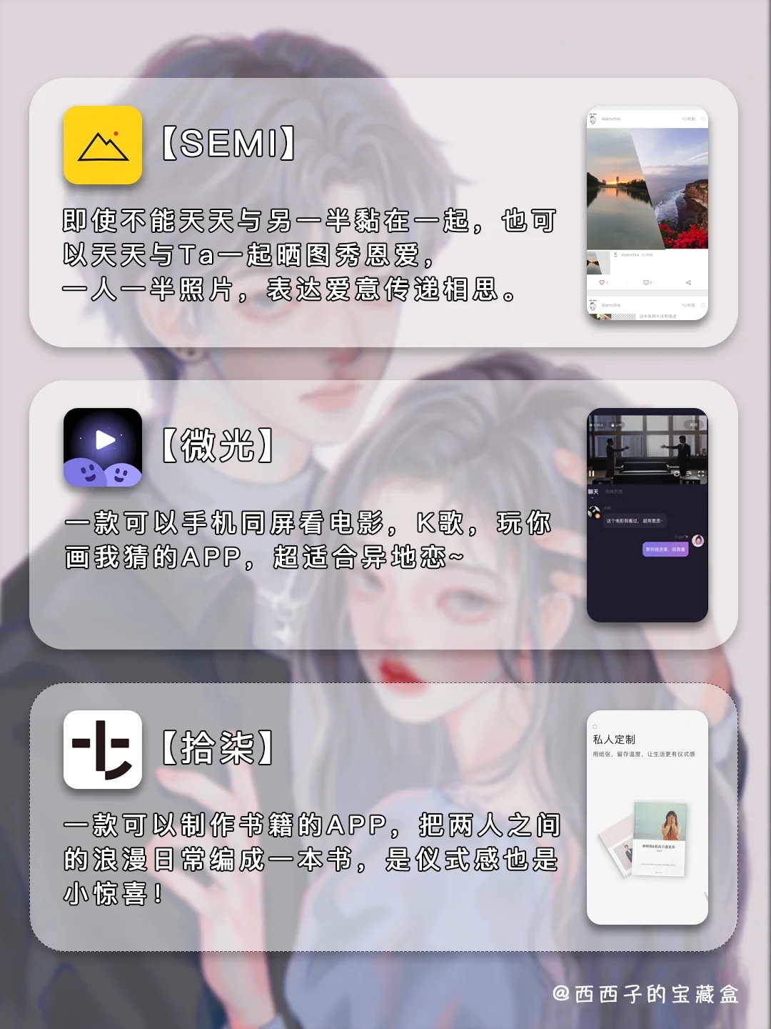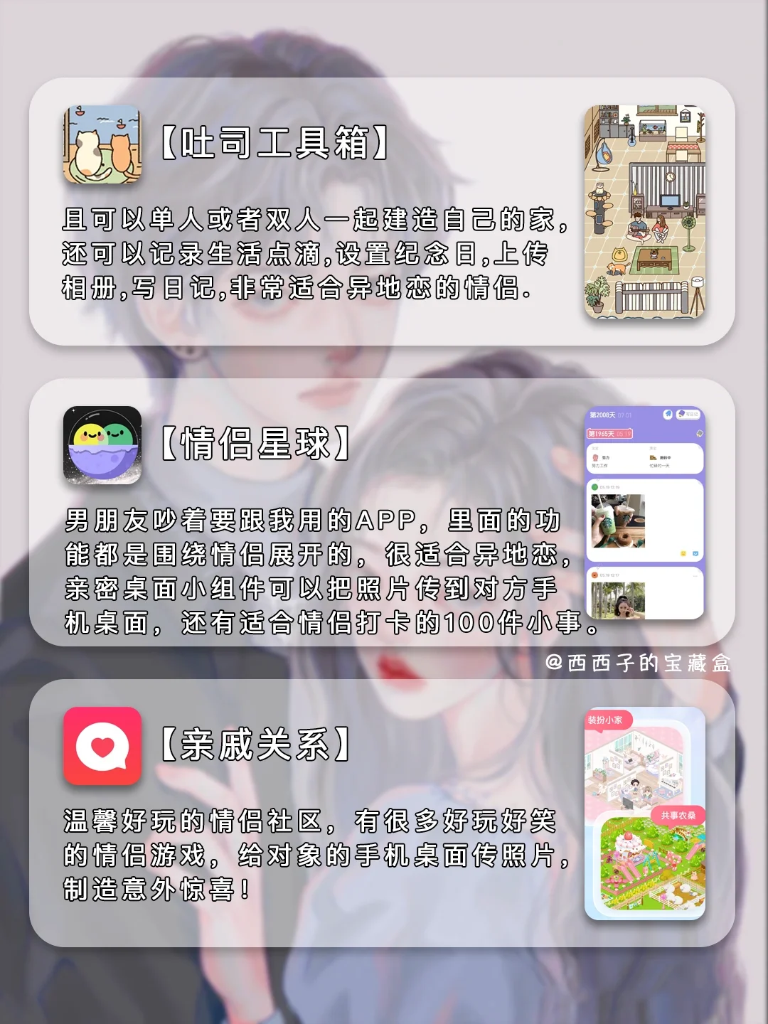 [萌萌哒R]hi~大家好呀~ 西西子整理了24款适合👫情侣用的APP,💓其中包含日常生活和双人游戏哦~ 💕就算是异地恋,也可以通过手机来互动升温,💞促进两个人之间的感情! [doge]部分APP/游戏玩法相似,可根据个人喜好选择~ · [飞吻R]所爱隔山海,山海亦可平! 让我们给彼此一个❤️的抱抱吧~
