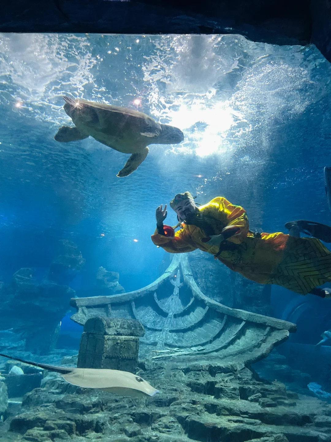 场馆分为两层,主要拍照跟表演集中在一楼,一进去海底隧道拍照很出片,有海龟鲨鱼游来游去。一定要注意表演的时间,有三个表演是一定不要错过的:海盗船剧场➕圆柱缸表演➕海洋剧场(室外)