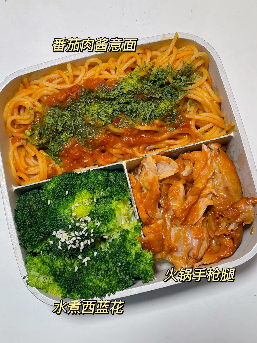 📍番茄肉酱意面+火锅手枪腿+西蓝花