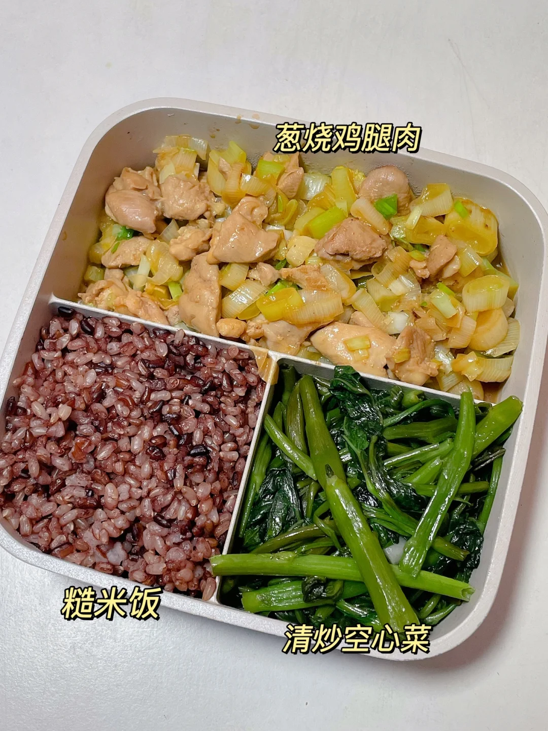 📍糙米饭+葱烧鸡腿肉+炒空心菜