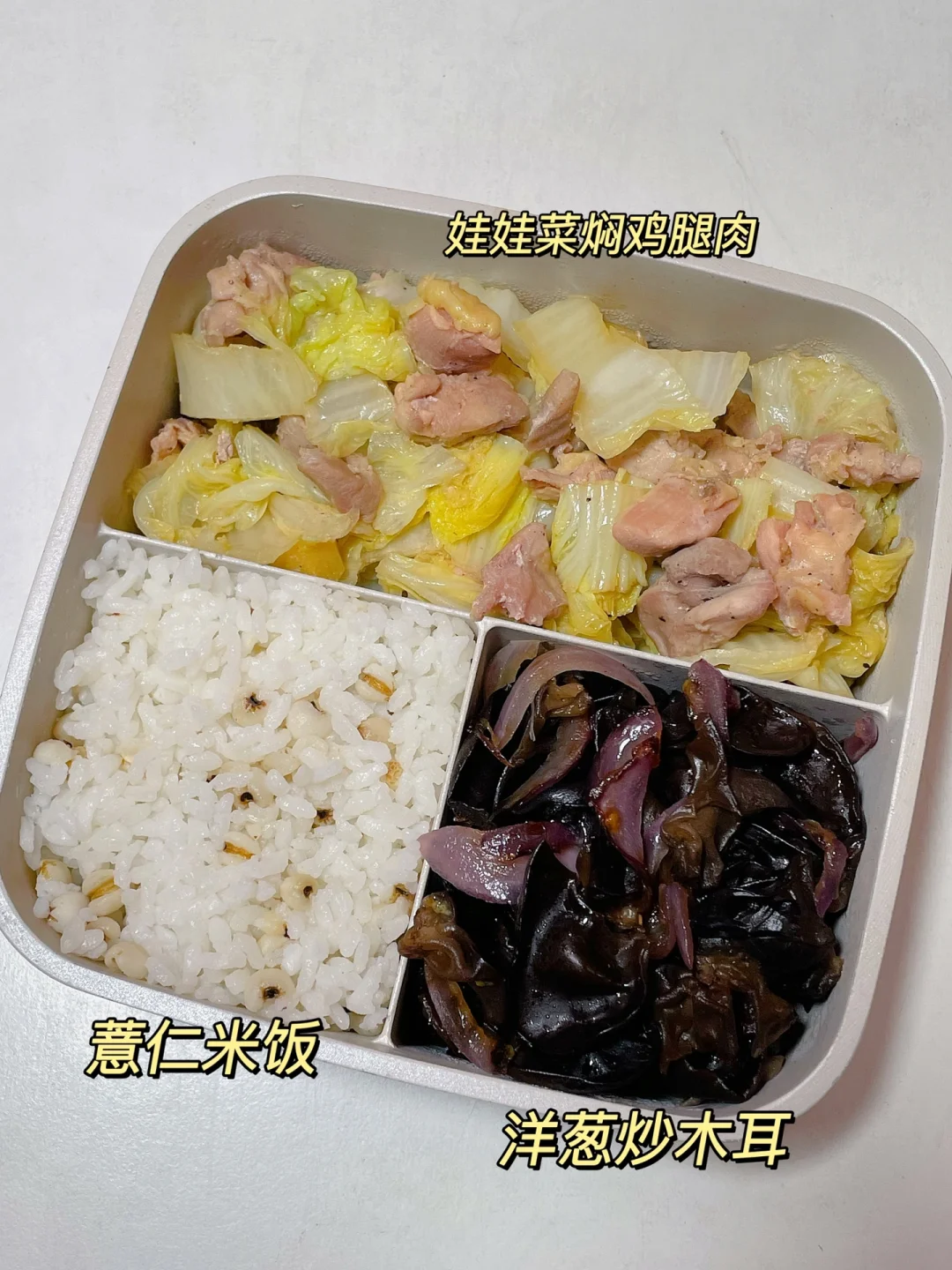 📍薏仁米饭+娃娃菜焖鸡腿肉+洋葱炒木耳
