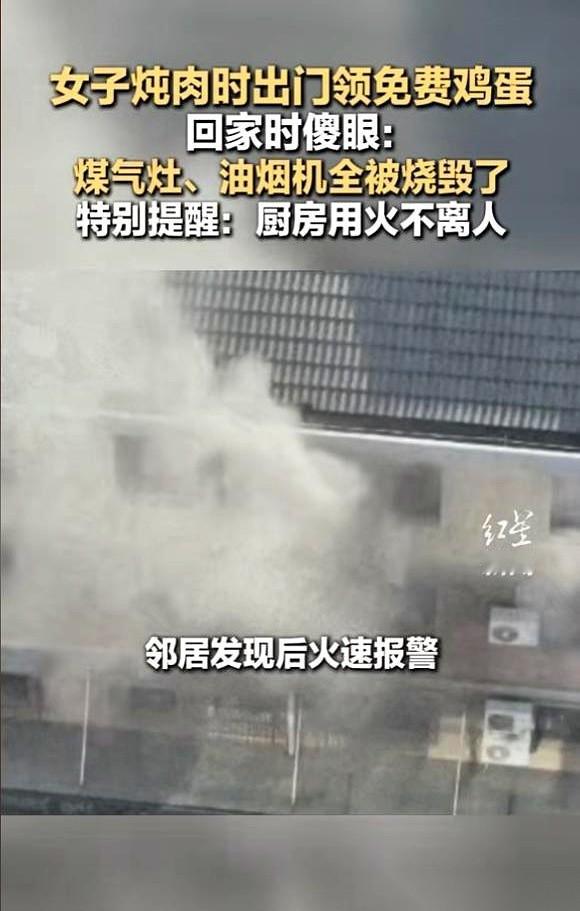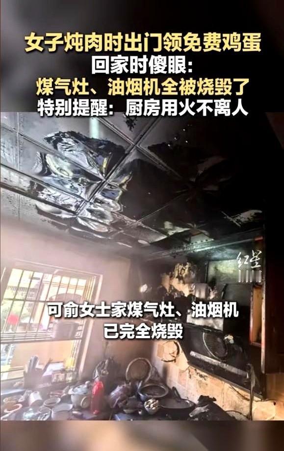 手里那筐免费鸡蛋还没捂热乎呢。 一开门,消防员正好从她家走出来,拍拍身上的灰。 厨房,黑了。 就出门那么一小会儿。 走的时候,锅里还“咕嘟咕嘟”炖着肉,心想着小火,能有啥事? 楼下喊免费送鸡蛋,那可得去啊,谁跟免费过不去。 结果呢? 免费的鸡蛋领回来了,价值八千块的抽油烟机、煤气灶,没了。 墙熏得黢黑,那股子焦味儿,估计得散好几个月。 你说这事儿,怪谁? 怪鸡蛋太诱人?还是怪自己心太大? 其实都不是。 就是那个“我以为没事”的侥幸心理,在每个人心里都住着。 “我就玩一会手机”、“我就离开一分钟”、“应该没问题吧”…… 生活里所有的“大坑”,不都是被这些“小以为”给挖出来的吗? 手里这筐鸡蛋,估计是她这辈子吃过的,最贵的一顿早餐了。 真金白银的教训,比啥都深刻。
