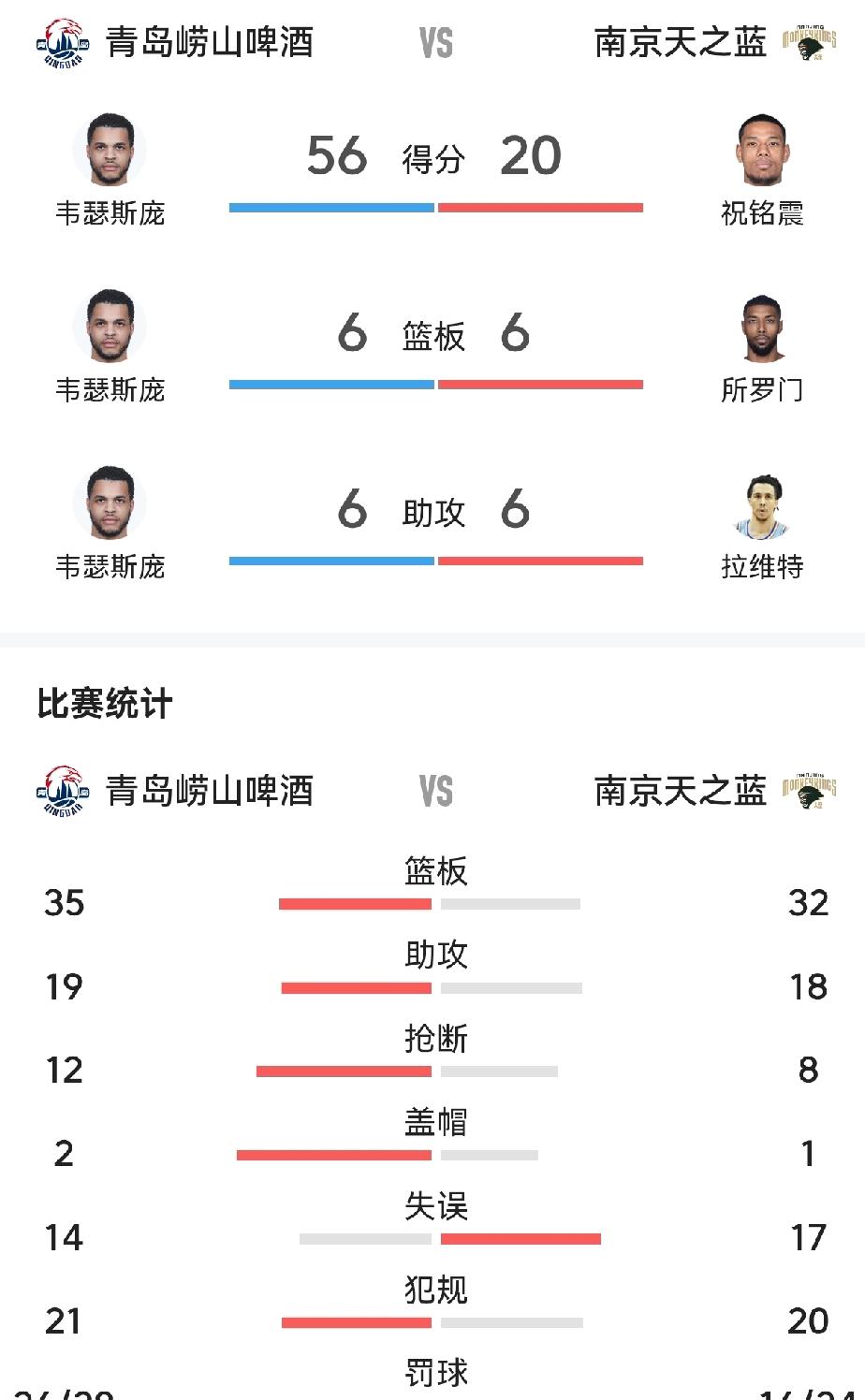 12月18日晚这场CBA比赛太精彩了!青岛男篮主场对阵南京同曦,最终以99比88获胜,迎来三连胜。 青岛队的威瑟斯庞堪称全场MVP,半场就砍下30分,全场更是轰下56分,还有6板6助,米奇26+5。比赛开始,青岛队就气势如虹,开局4:0、又一波6:0,半节就15:6领先。首节结束27:20领先。第二节南京同曦虽有反扑,还一度反超,但青岛队很快又夺回优势,半场56:39领先。之后青岛队一直保持领先。南京队祝铭震20分4板4个三分球,郭昊文18分,也有出色表现,不过这场比赛还是青岛队更胜一筹。 虽然杨瀚森远赴美国打球,但是他们的战斗力并不弱。刘维伟主教练厉害! 南京同曦男篮 南京男篮cba 南京队