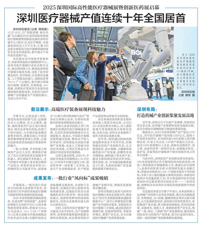 12月18日,以“创新药械融合共赢”为主题的2025深圳国际高性能医疗器械展暨创新医药展在深圳会展中心(福田)正式拉开帷幕。本届展览面积达3万平方米,汇聚300余家全球医药与医疗器械领域的领军企业及科研机构,集中展示千余件前沿创新产品。