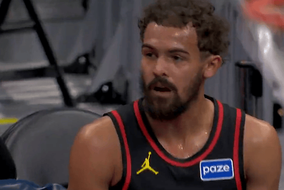 特雷-杨复出首节登场5分钟,目前1中0没得分拿到2次助攻