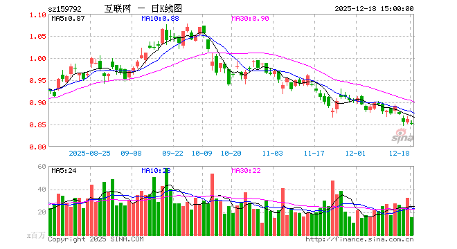 12月18日,港股通互联网ETF(159792)跌1.28%,成交额12.95亿元。当日份额增加1.63亿份,最新份额为932.44亿份,近20个交易日份额增加16.56亿份。最新资产净值计算值为798.73亿元。