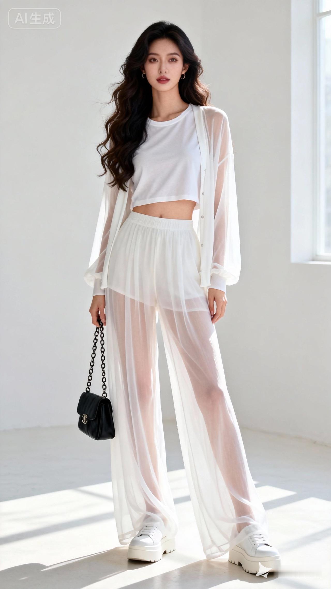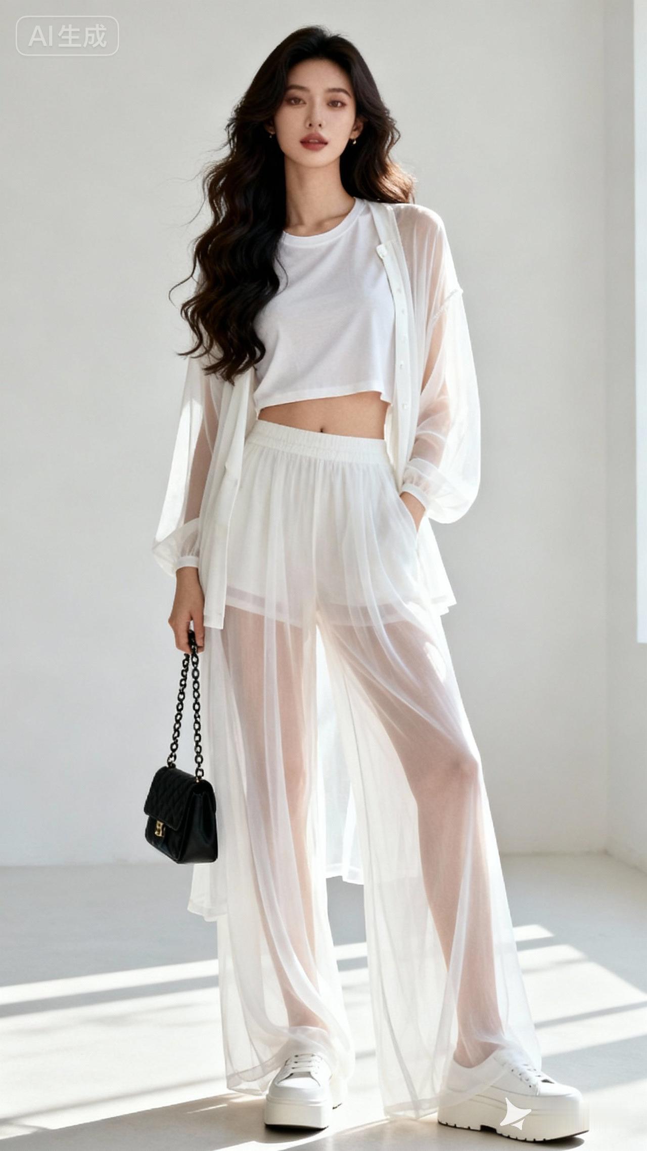 轻盈飘逸的白色透视裤,搭配简约白色T恤,尽显优雅与时尚。
