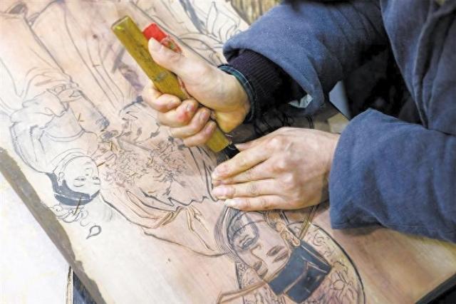 非遗传承人童敏在进行年画刻版。